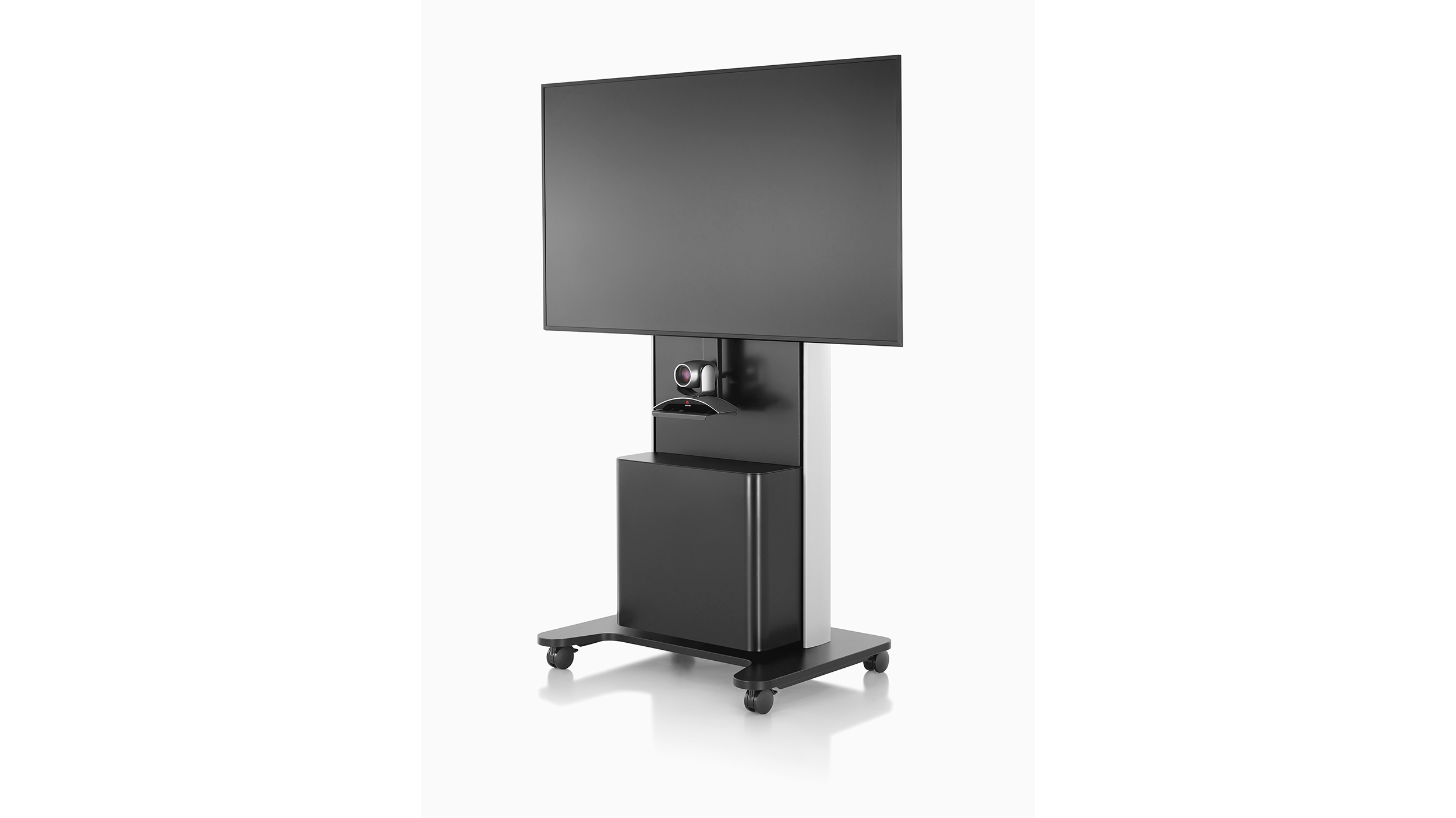Permite que las personas que trabajan juntas disfruten de una experiencia a distancia más natural. AV/VC One puede soportar una pantalla de hasta 80” (203 cm) o dos pantallas de hasta 65” (165 cm) cada una, ya sea en posición vertical u horizontal. El estante frontal opcional brinda almacenamiento adicional, y un montaje de cámara ajustable le permite elegir la mejor posición para la aplicación.
