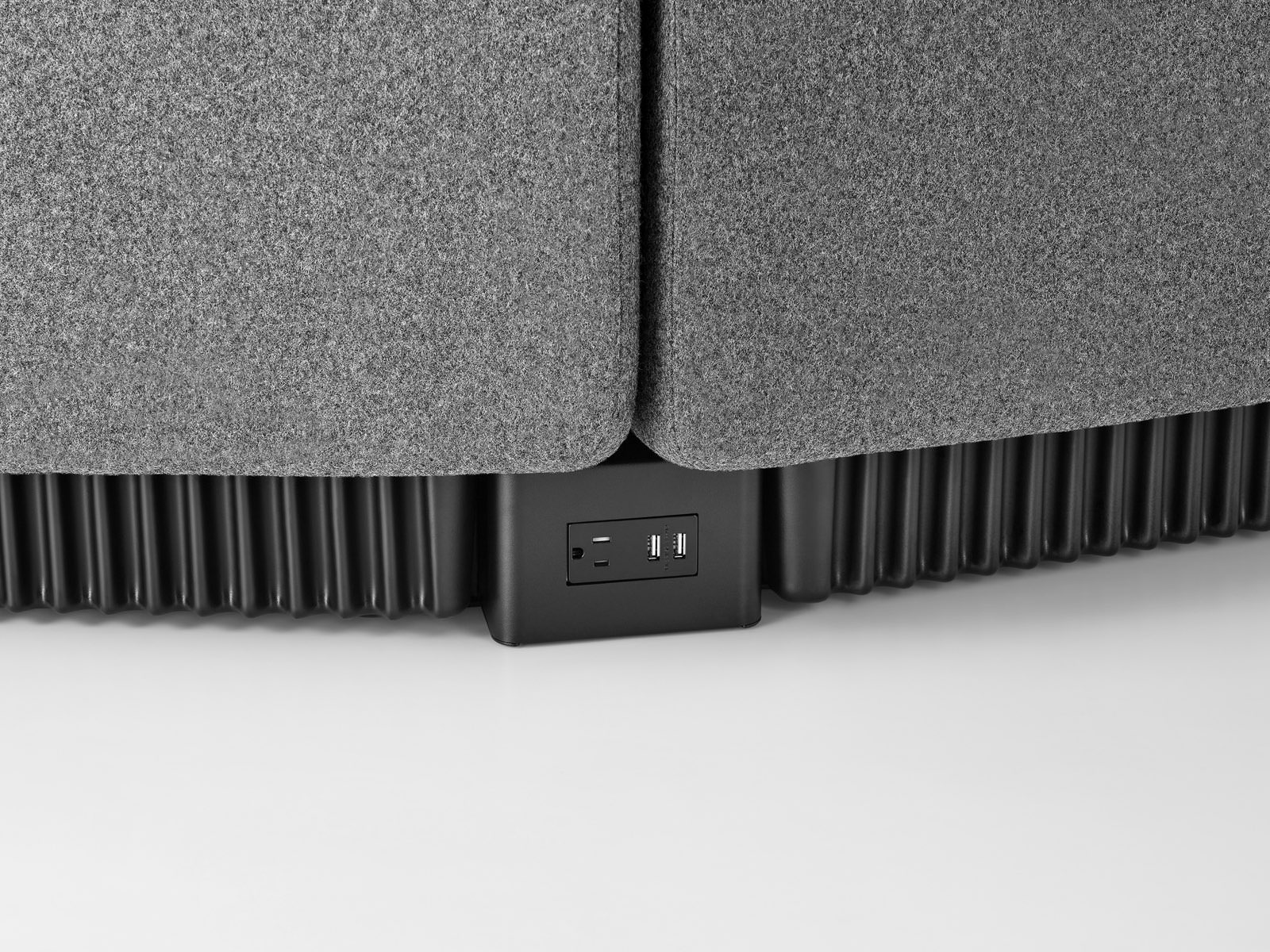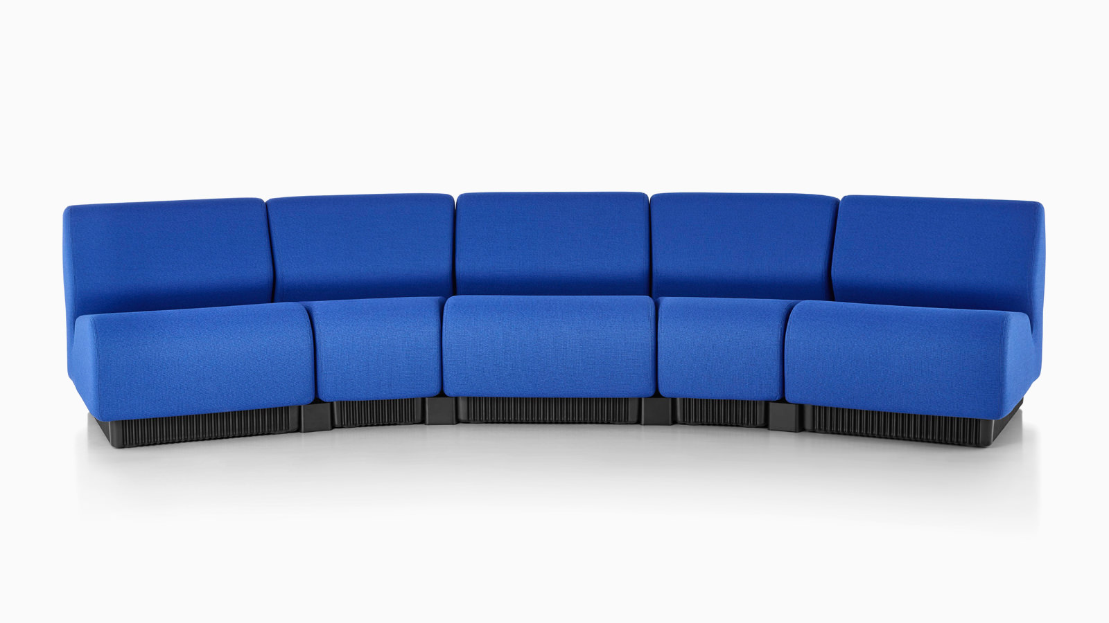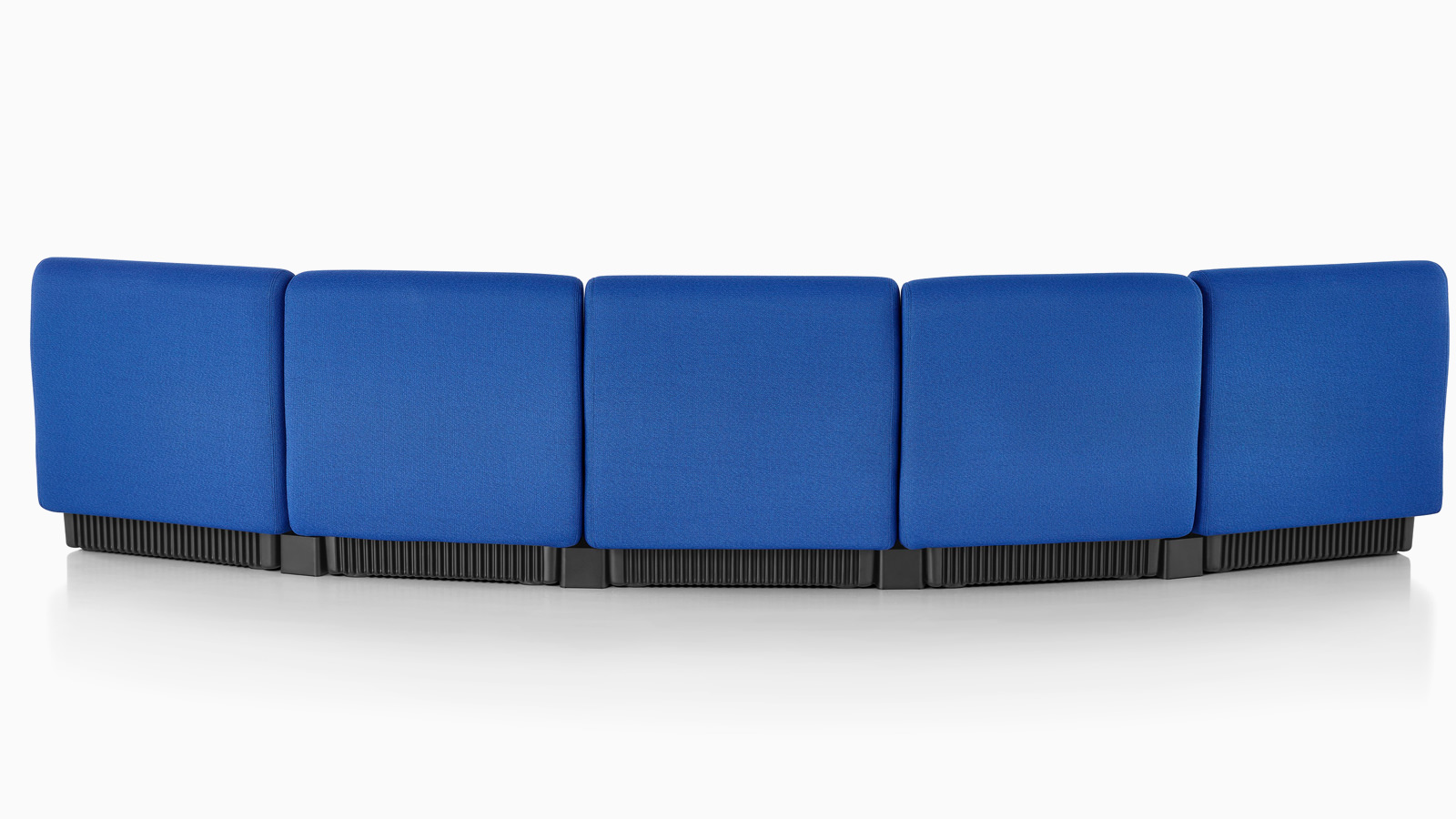 Cinco unidades simples, cada una con una forma moldeada y esculpida que ofrece soporte con una apariencia suave, permiten que el sistema adquiera una multitud de formas. Los bolsillos profundos en la parte posterior permiten que el aire circule alrededor de los usuarios y facilitan la limpieza. Disponible en una variedad de textiles, cada pieza viene completamente tapizada en el frente, la parte posterior y los costados, por lo que puede servir como asiento final, del medio o individual, sin importar la disposición. Las unidades se unen de forma segura con conectores simples y se desprenden para un rápido reordenamiento.
