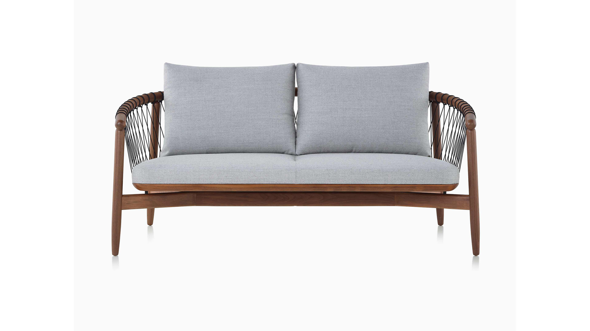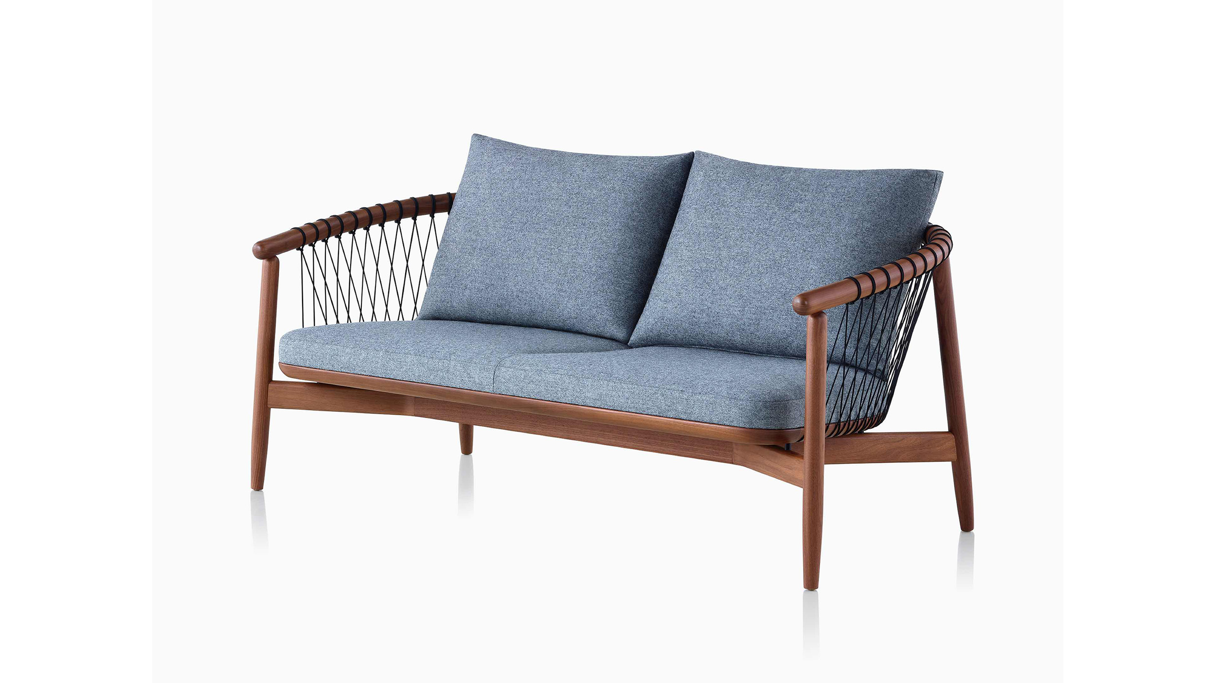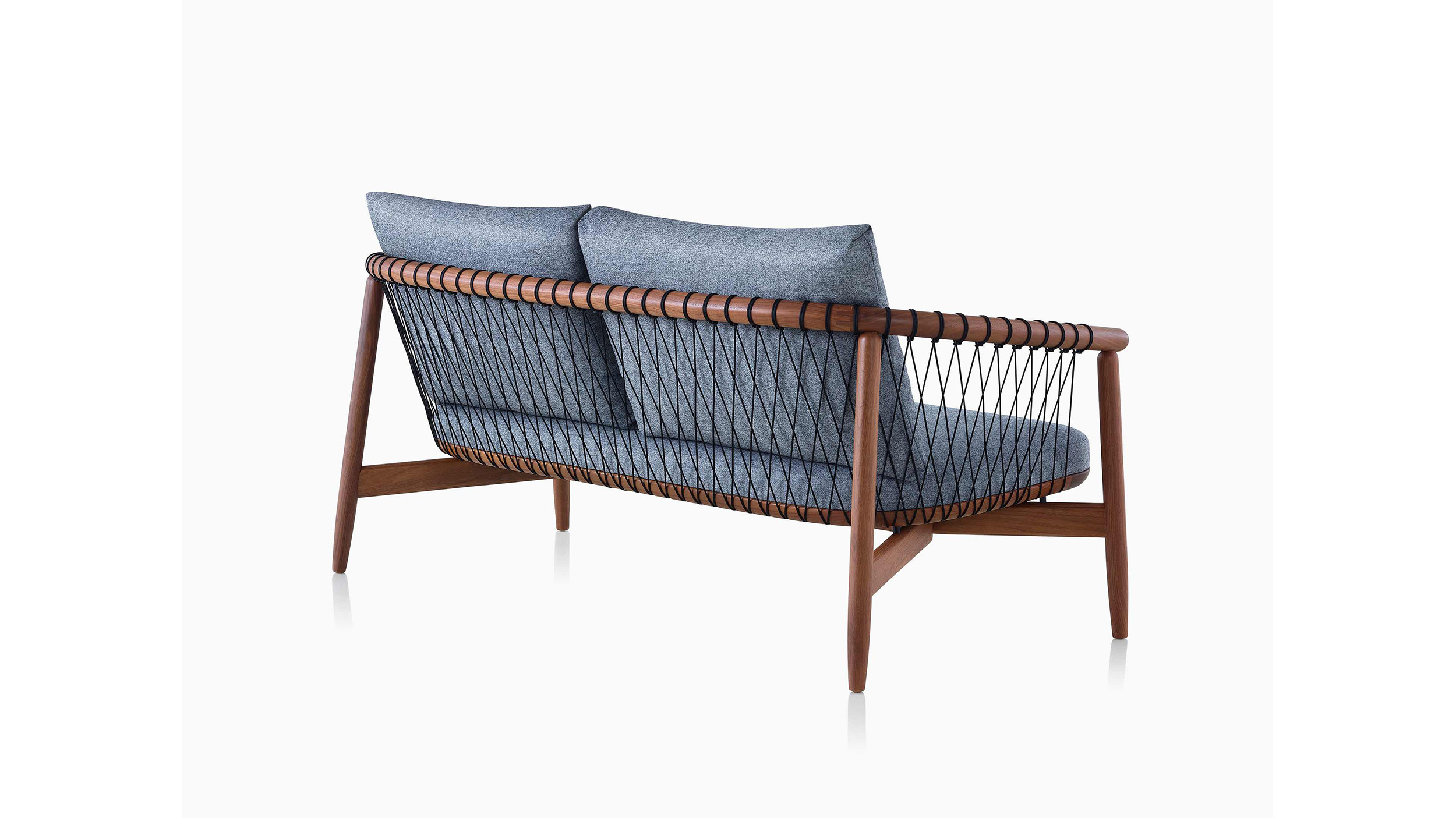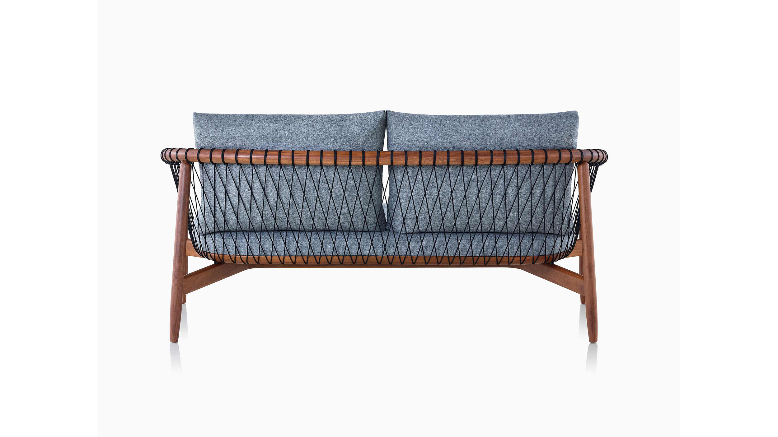 Un entramado de cuerdas para paracaídas tejido a mano, otorga al sofá Crosshatch su silueta transparente y ligera. Una bienvenida a la familia de sillería Crosshatch en la que se pueden sentar dos personas. El sofá está disponible en una amplia selección de acabados con marco de madera, opciones de tapicería y colores de cuerda. Diseñado por EOOS para Geiger, el sofá Crosshatch es parte de la colección Herman Miller.