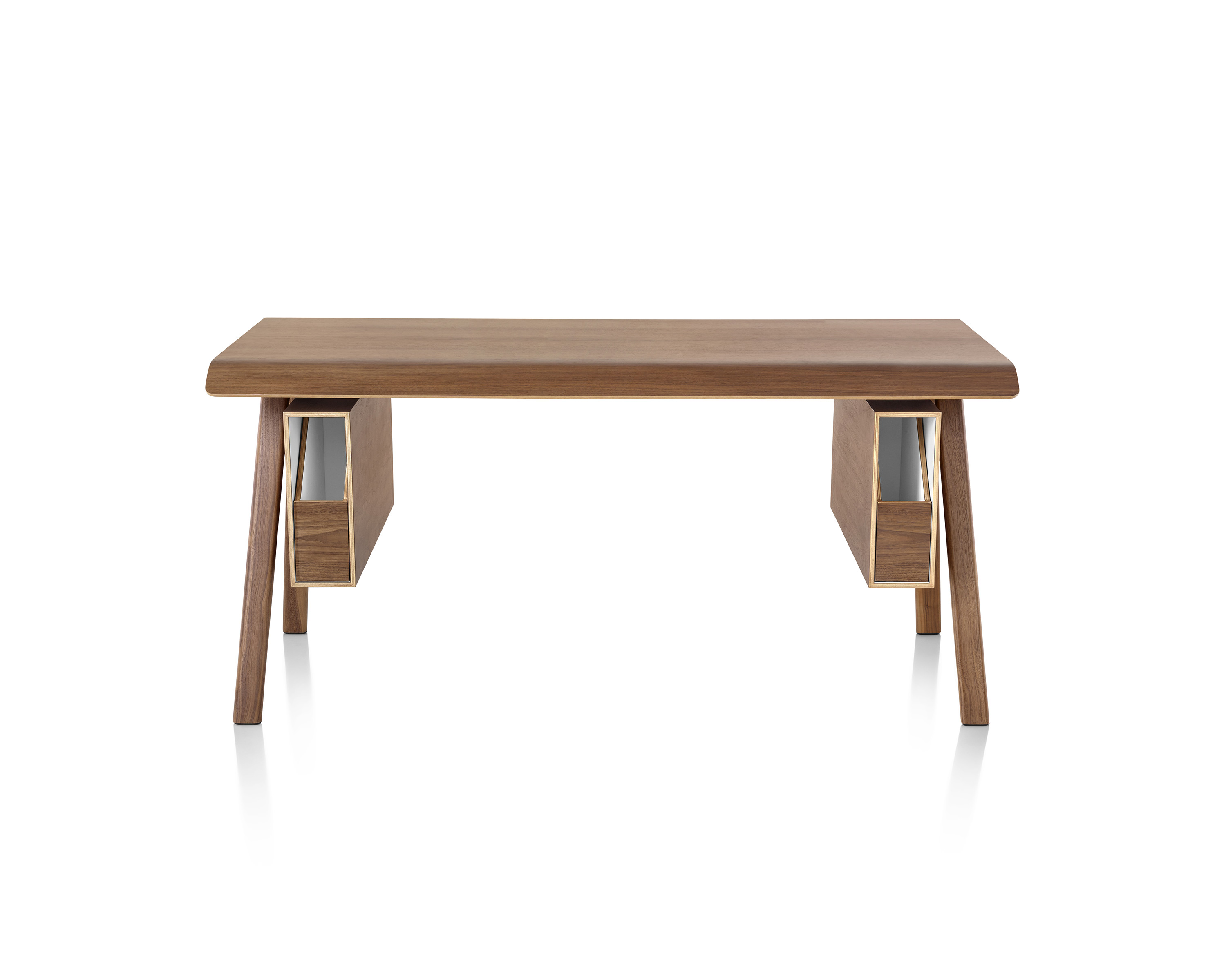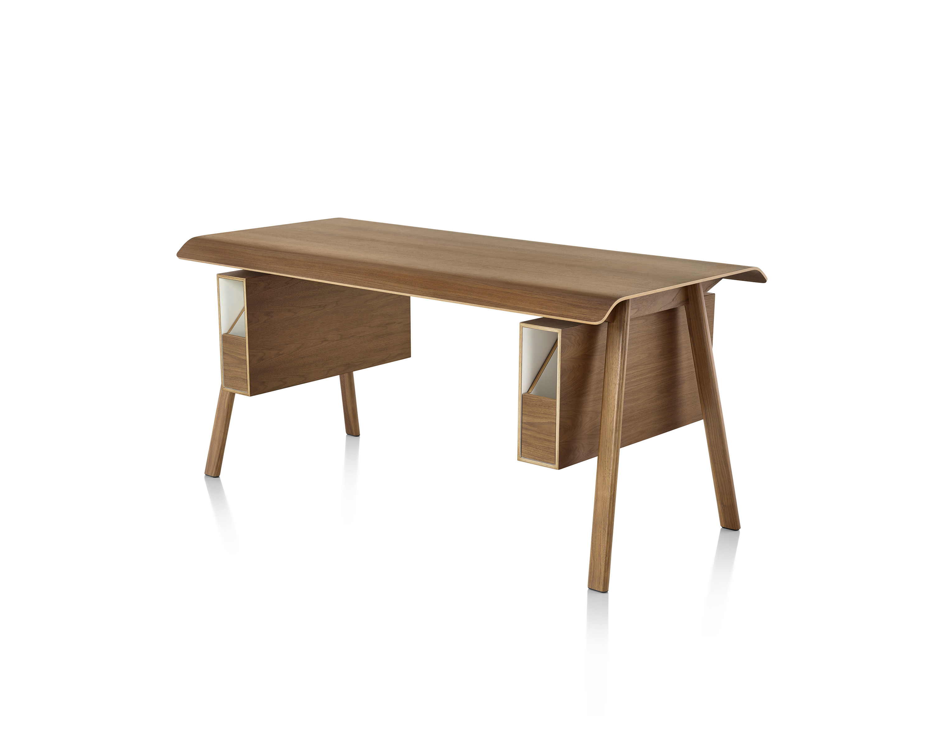 El diseñador Todd Bracher asegura dicho equilibrio refinando la idea de un escritorio en su esencia. Con sólidas patas de madera, bordes suaves, una cubierta en madera laminada moldeada y soluciones sin precedentes de manejo de cables y almacenaje, este escritorio es agradable física y estéticamente.
