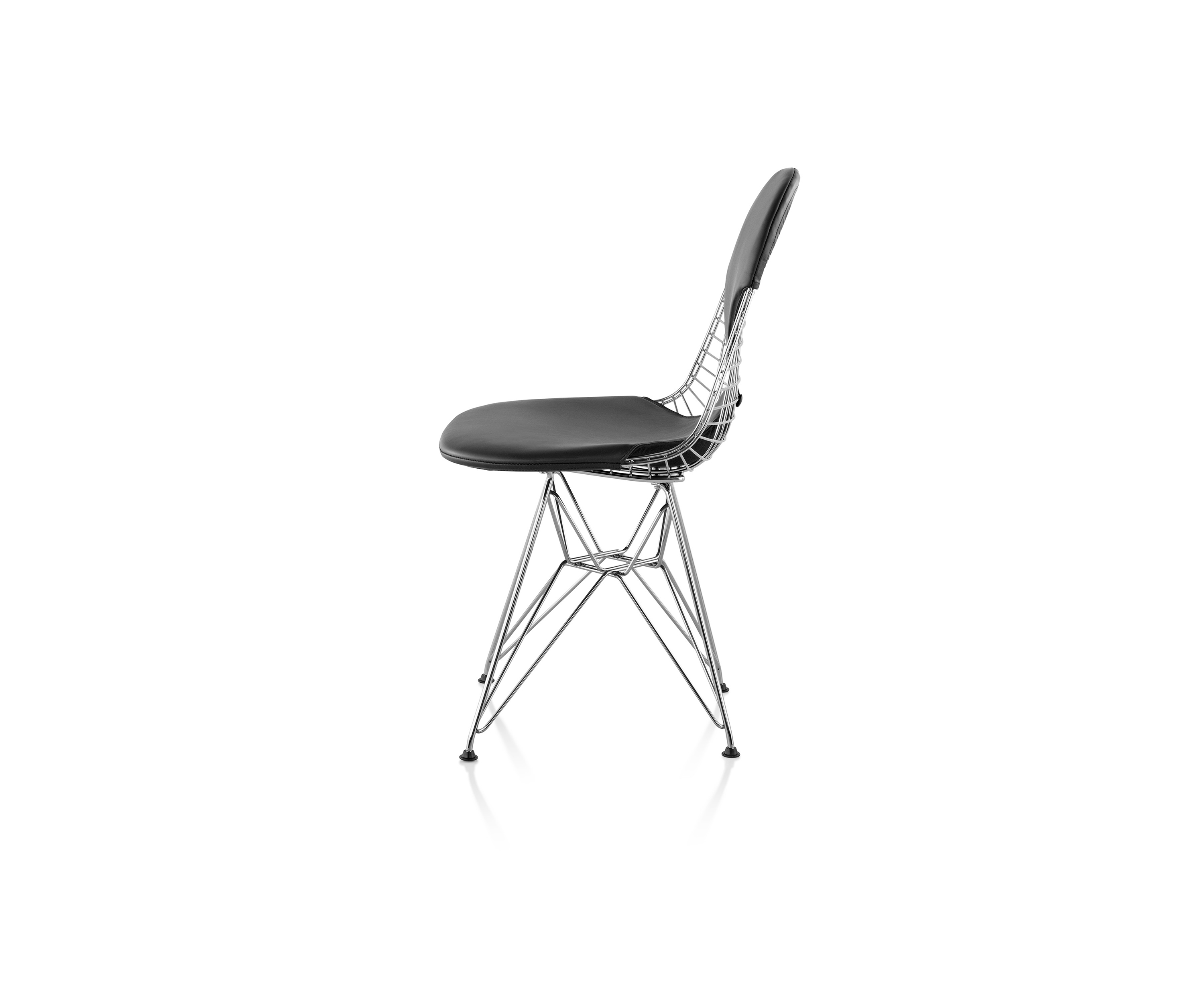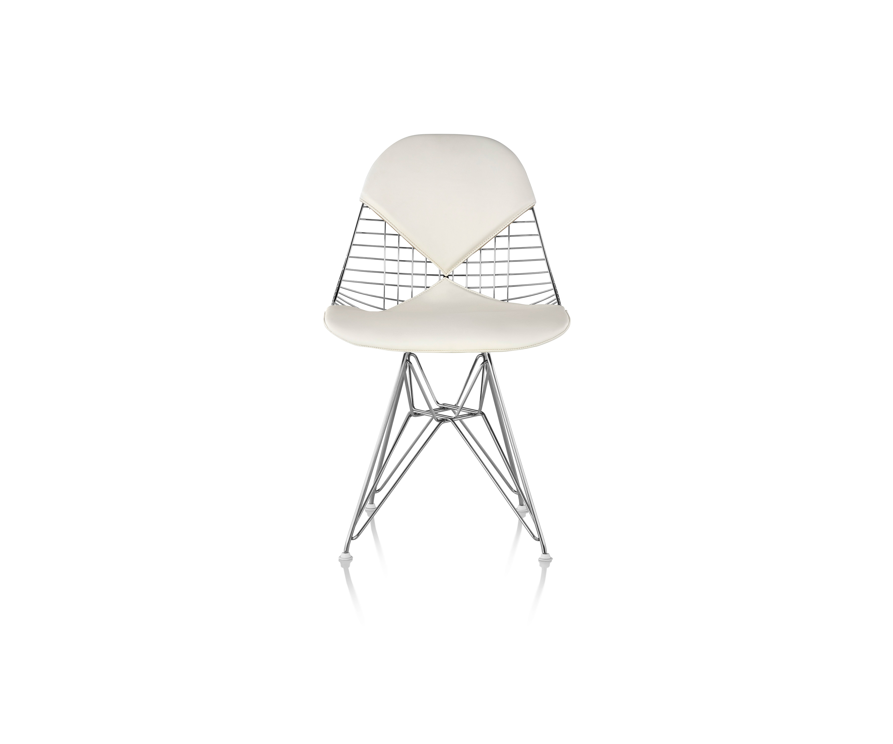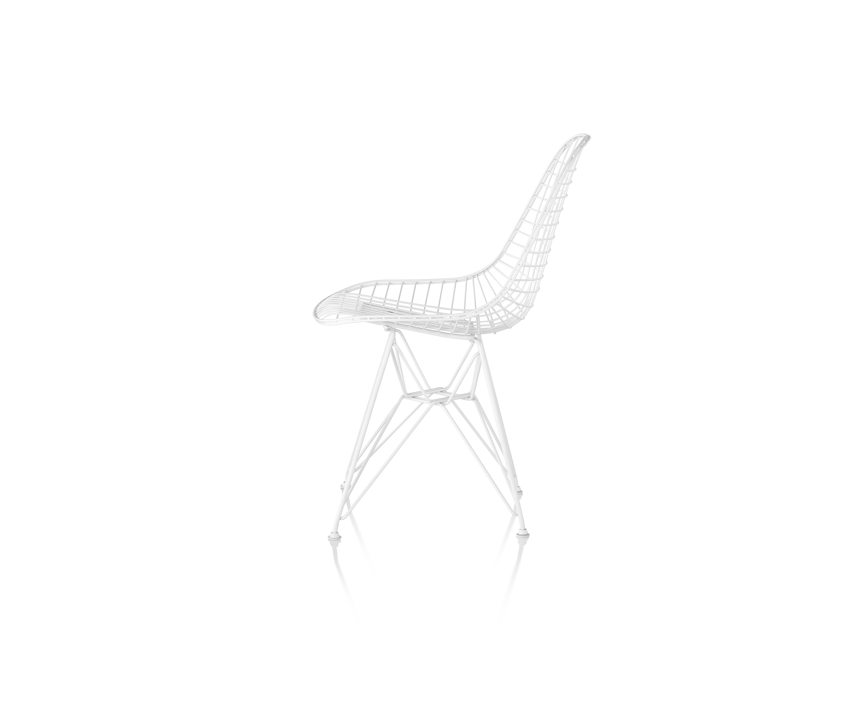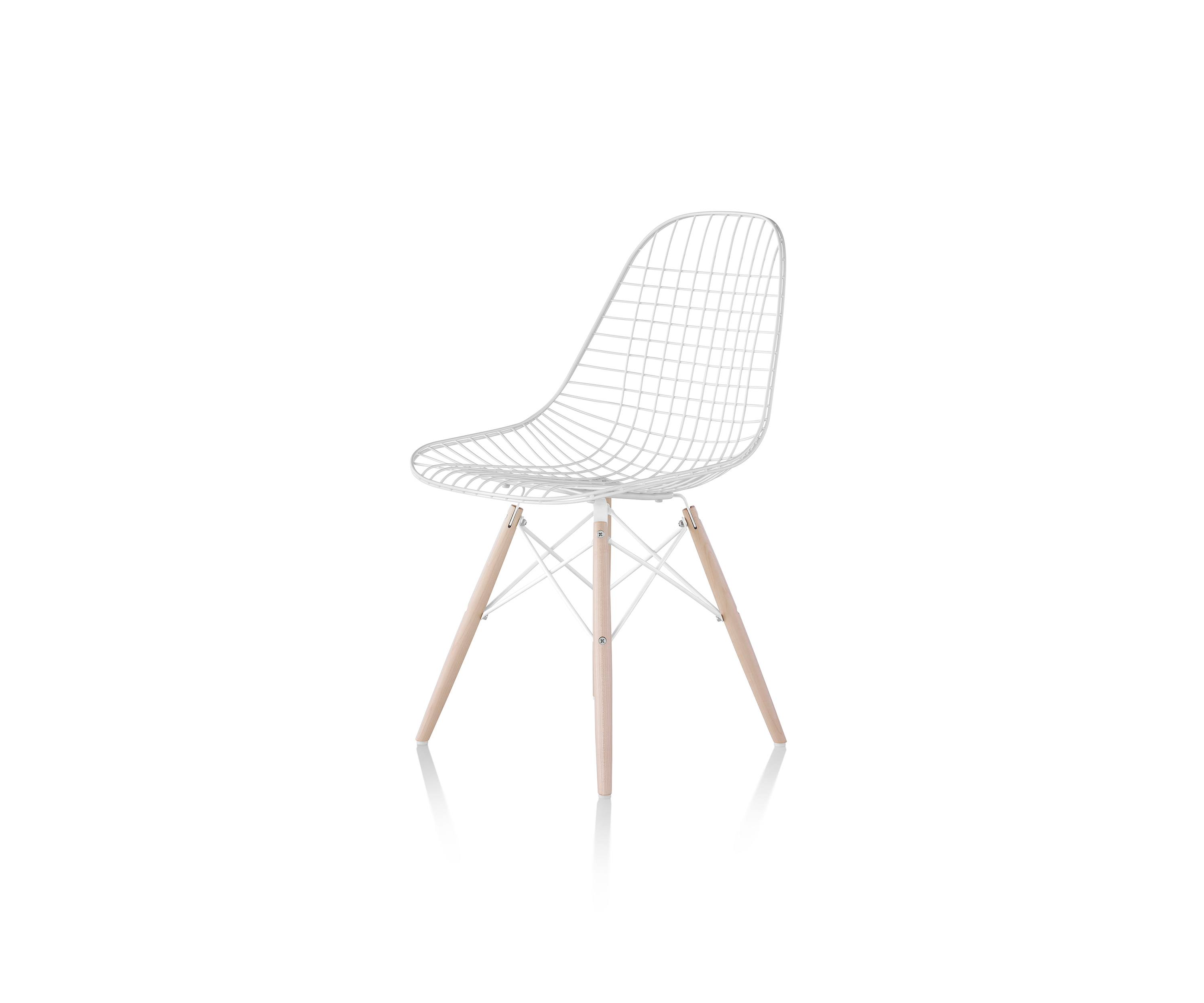 En la década de 1950, Eames Office comenzó a experimentar en el curvado y la soldadura de alambre. Inspirados en bandejas, formas de vestidos y canastas, el equipo desarrolló una serie de piezas, incluida la versión de alambre de la forma Shell. La silla Eames Wire viene con una base de alambre y una almohadilla opcional y entrecruzada o una almohadilla "bikini" de dos piezas realizadas en piel.