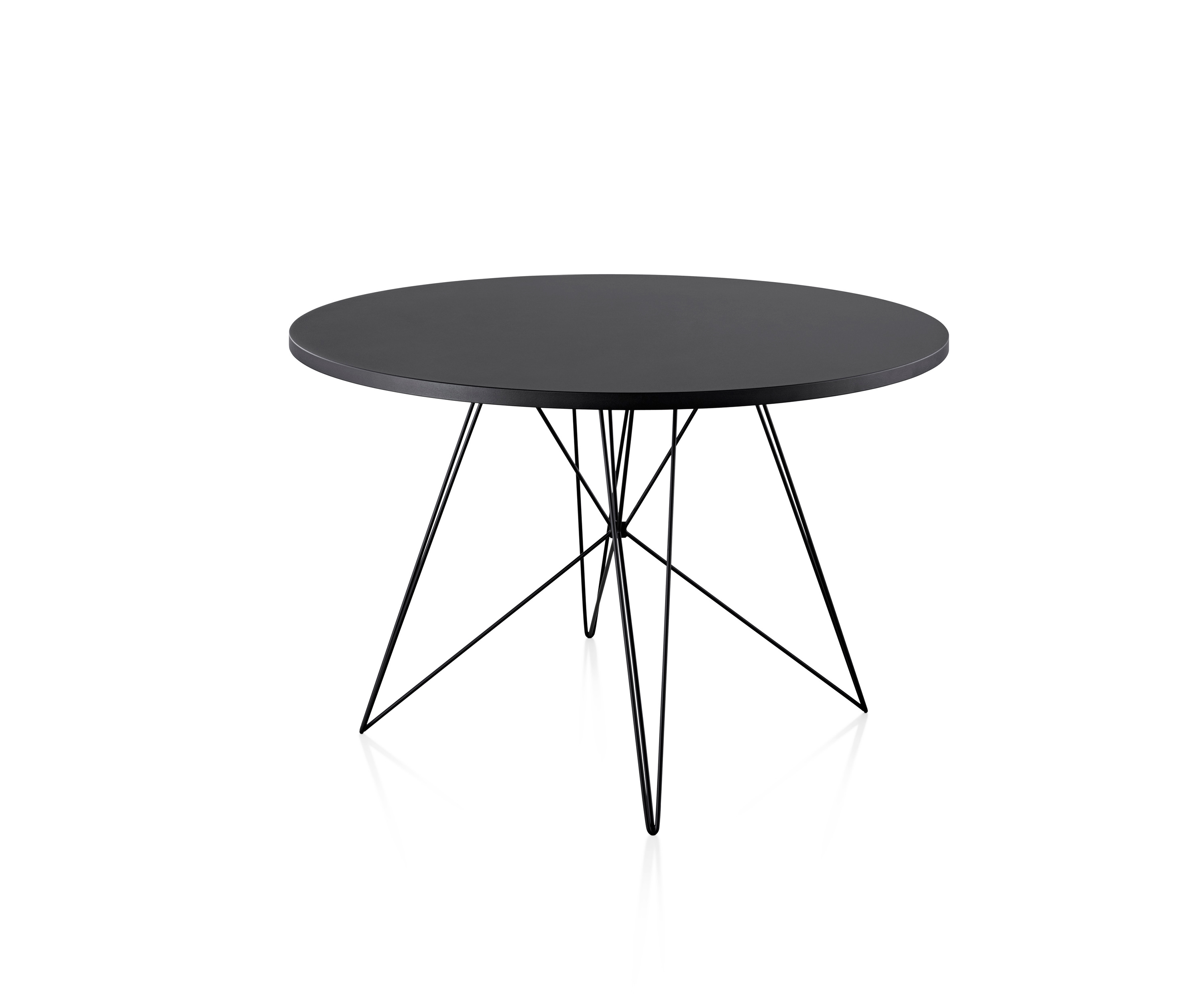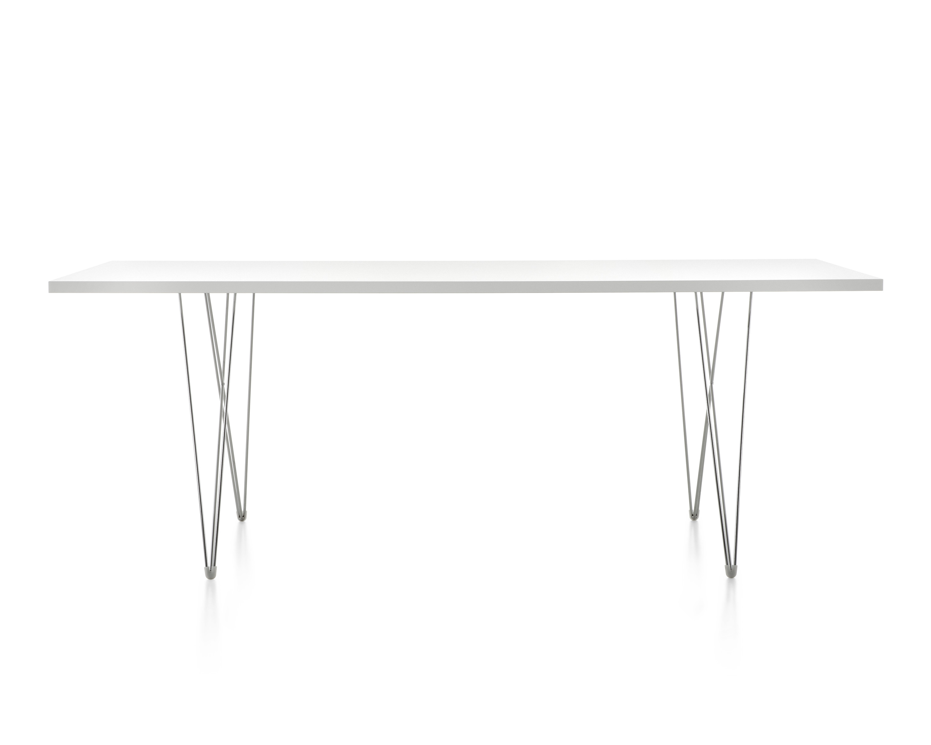 Las mesas Tavolo son robustas y versátiles, están compuestas por bases con varillas de acero en cromo o resina epoxy blanca y tienen una superficie de MDF con cubierta de polímero. Combinan perfectamente bien con las sillas de plástico moldeado Eames con bases de alambre.