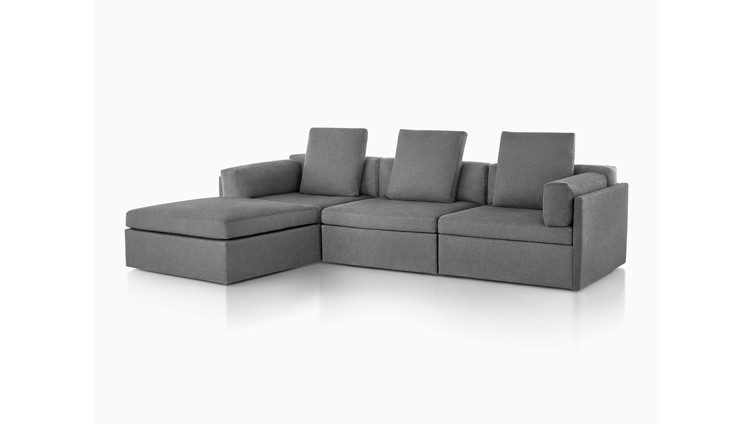 Completamente tapizada y sin patas visibles, la sillería lounge Module ofrece una comodidad y un apoyo lujosos para descansar. El marco contiene dos pulgadas (5 cm) de relleno. Con costuras superiores para un estilo suave, no cuadrado, los cojines del respaldo tienen un relleno de fibra con plumas y plumón. Los cojines laterales desmontables también pueden usarse como suaves reposacabezas. Los cojines sueltos se pueden reorganizar para una comodidad óptima y posturas para sentarse y relajarse.