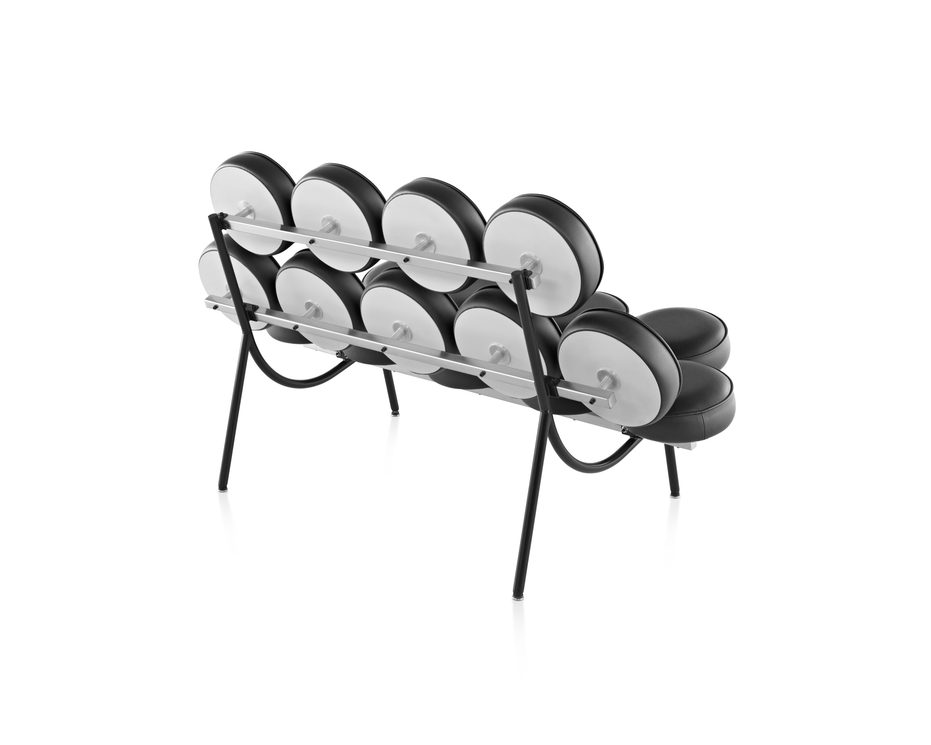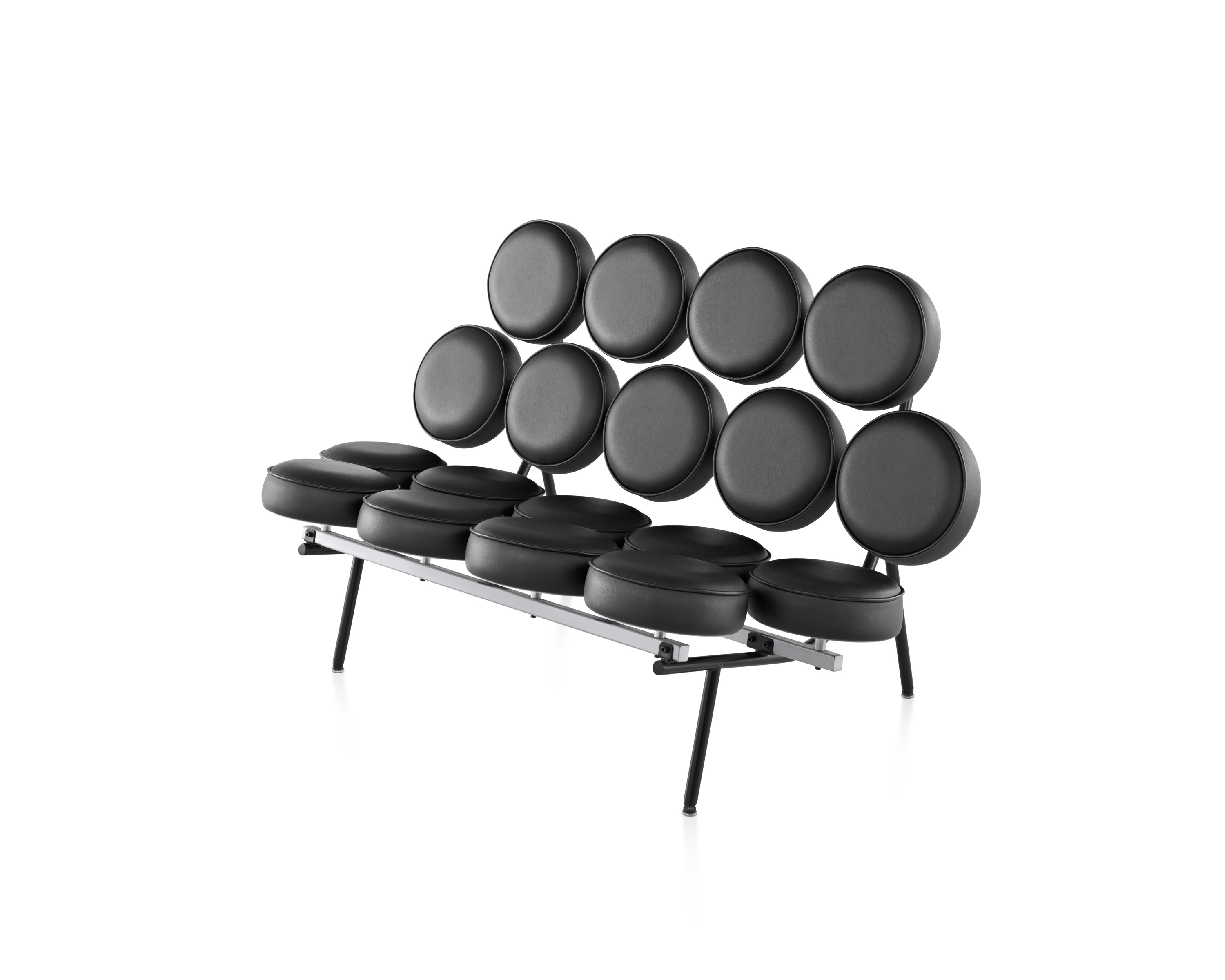 El sofá Marshmallow puede ser un testimonio alegre o dramático en un vestíbulo, una sala de estar o un living. Su diseño maravilloso incluye 18 almohadones redondos, cómodos, que parecen flotar en una estructura de acero tubular cepillado.
