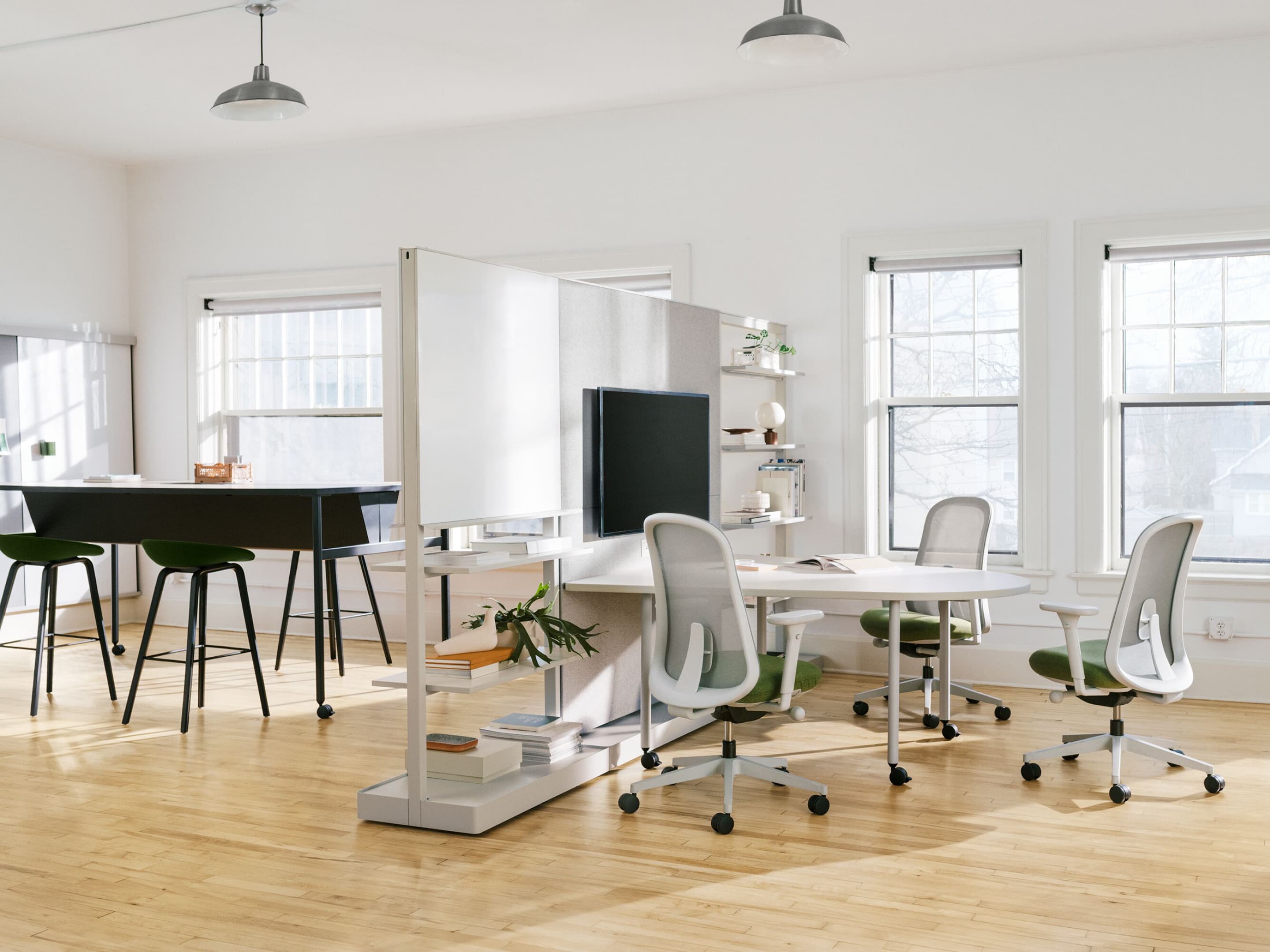 La mesa para reuniones en grupo OE1 permite una colaboración rápida en oficinas abiertas y salas de reunión. Al combinarla con un panel, se convierte en el lugar ideal para compartir ideas. Parte de la Colección espacio de trabajo OE1.