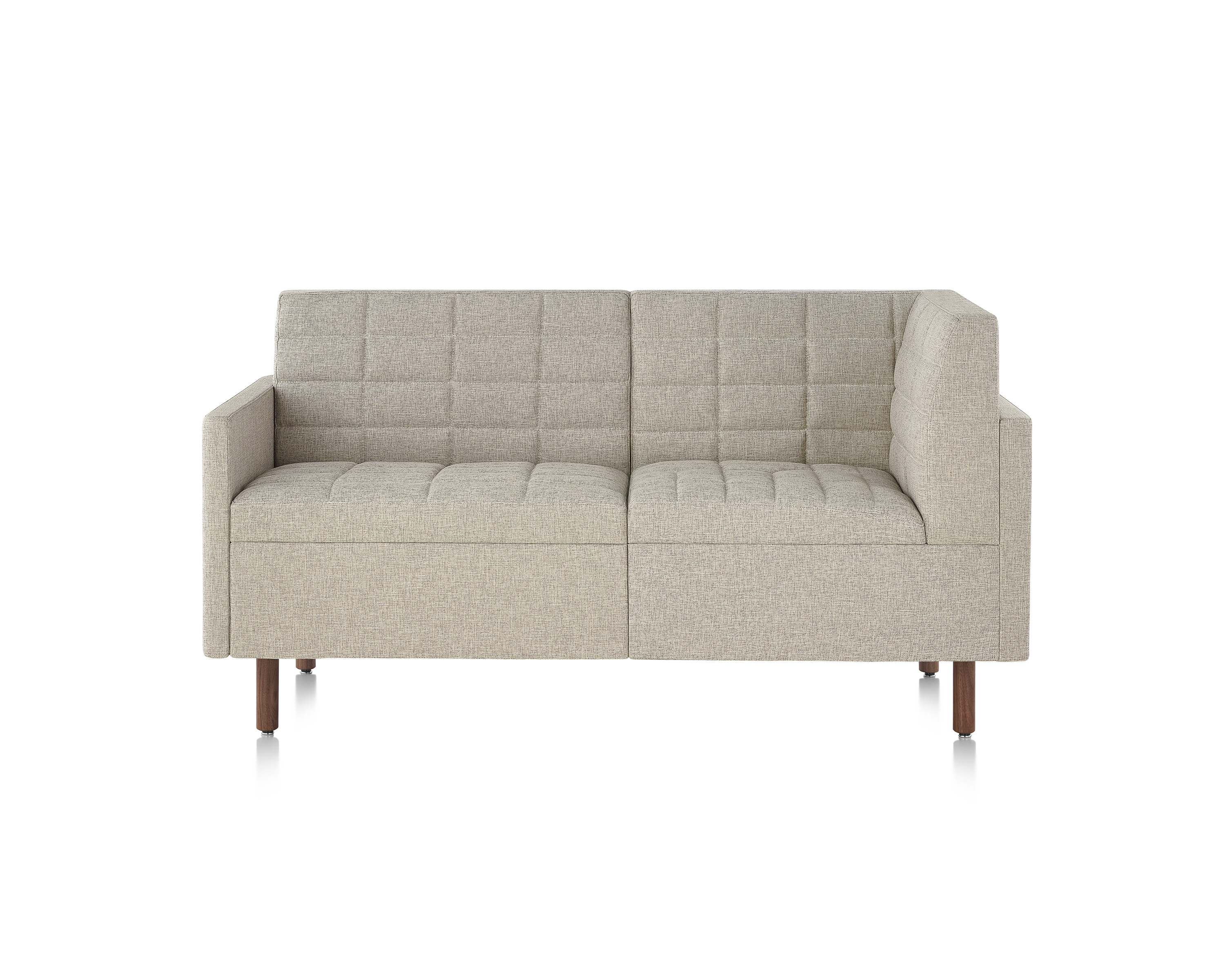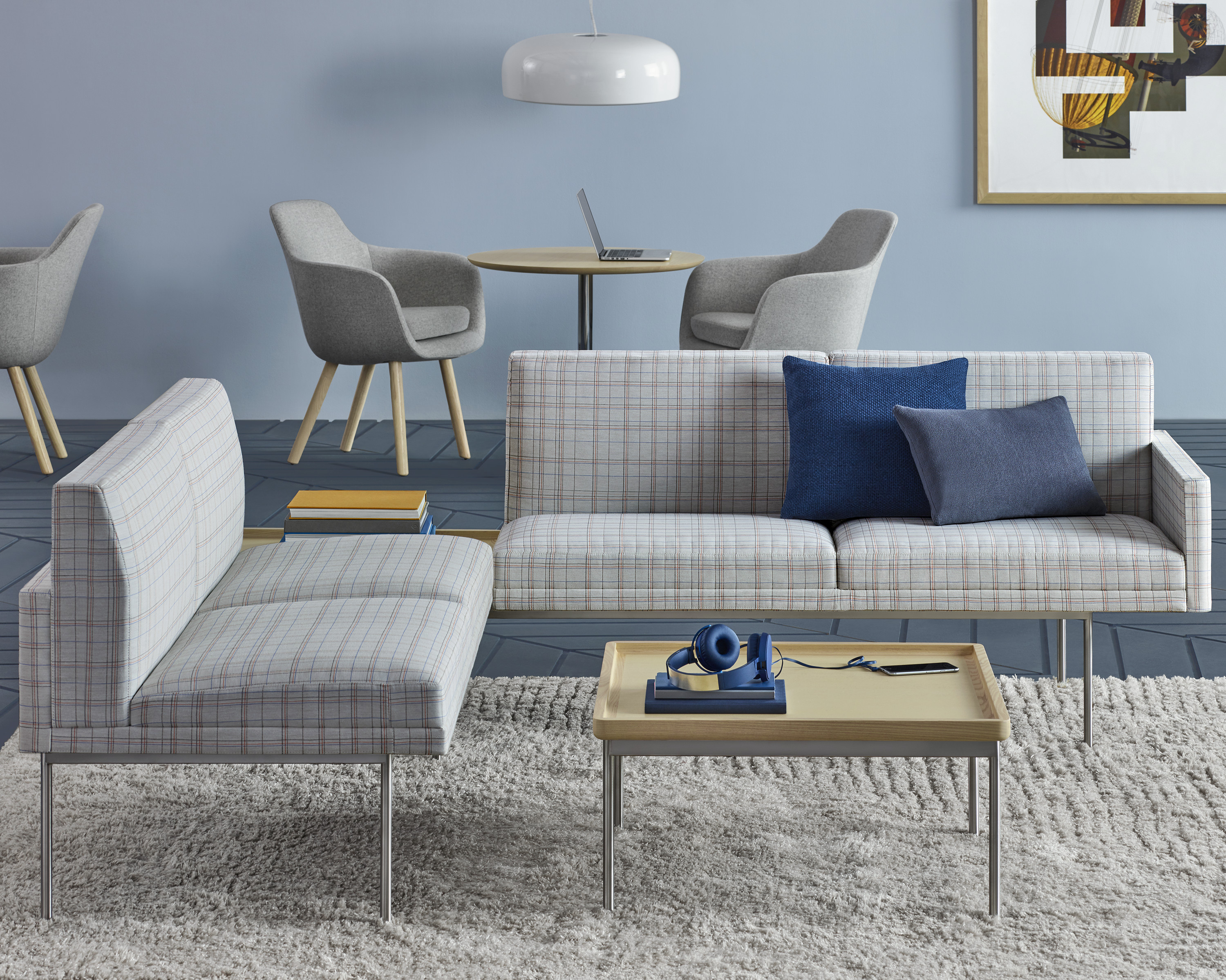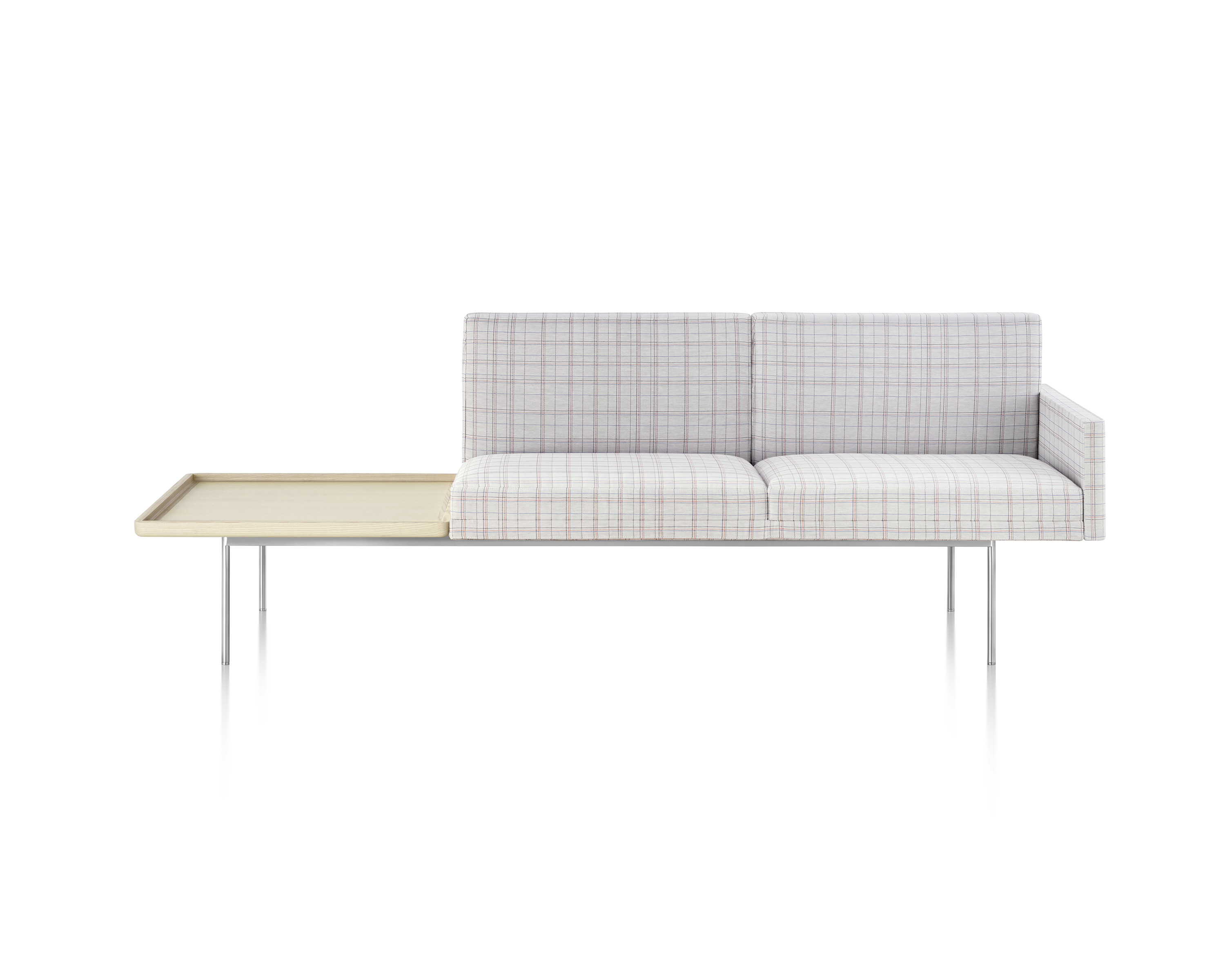 Presenta un perfil bajo y elegante gracias a la banda horizontal que forman el respaldo y los brazos (opcionales). Su apariencia es aún más liviana debido a la tapicería a medida, esmerada, que cubre los almohadones delgados de espuma de doble densidad. Cada pieza está disponible en una amplia gama de tapizados con o sin acolchado.