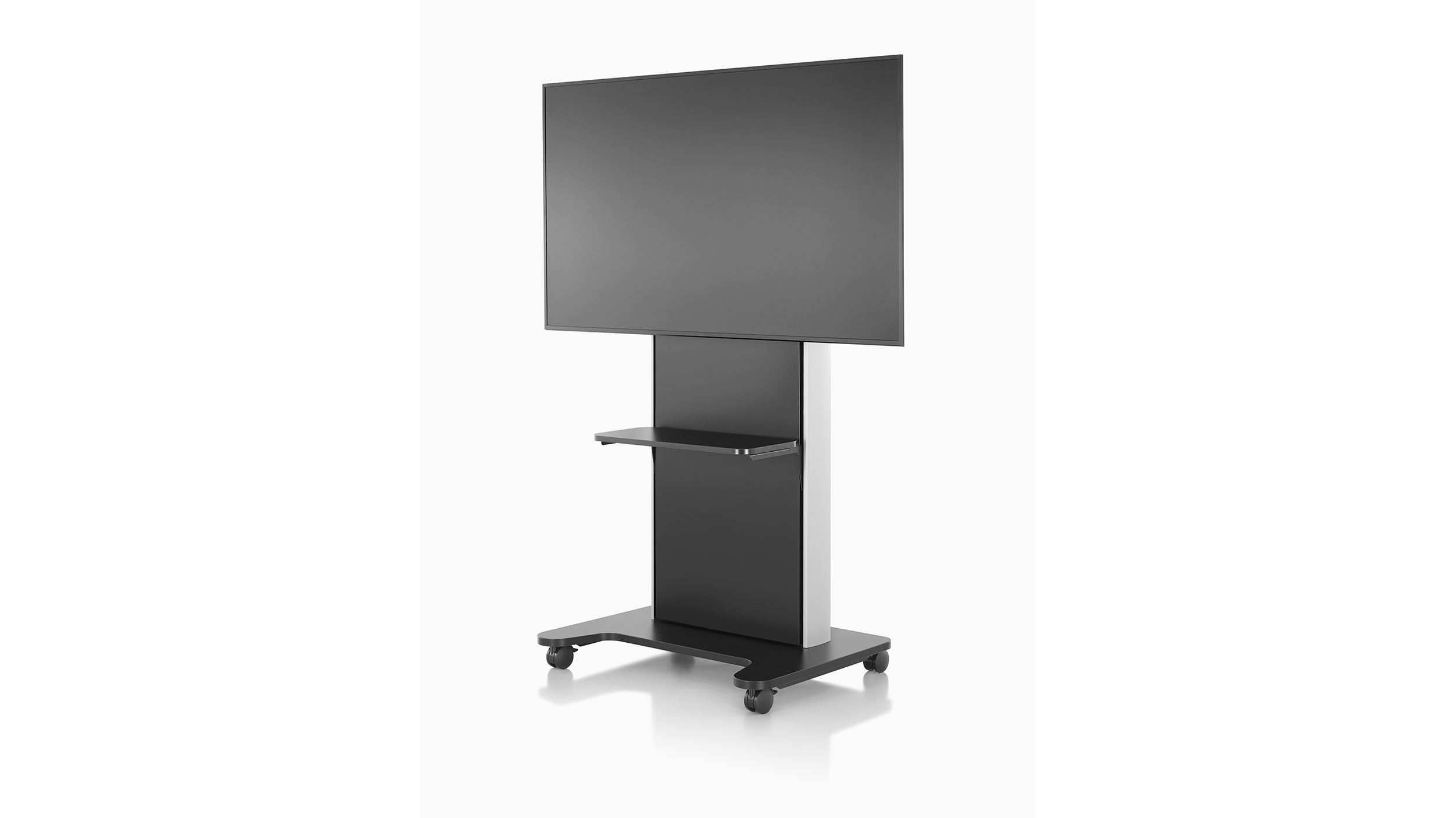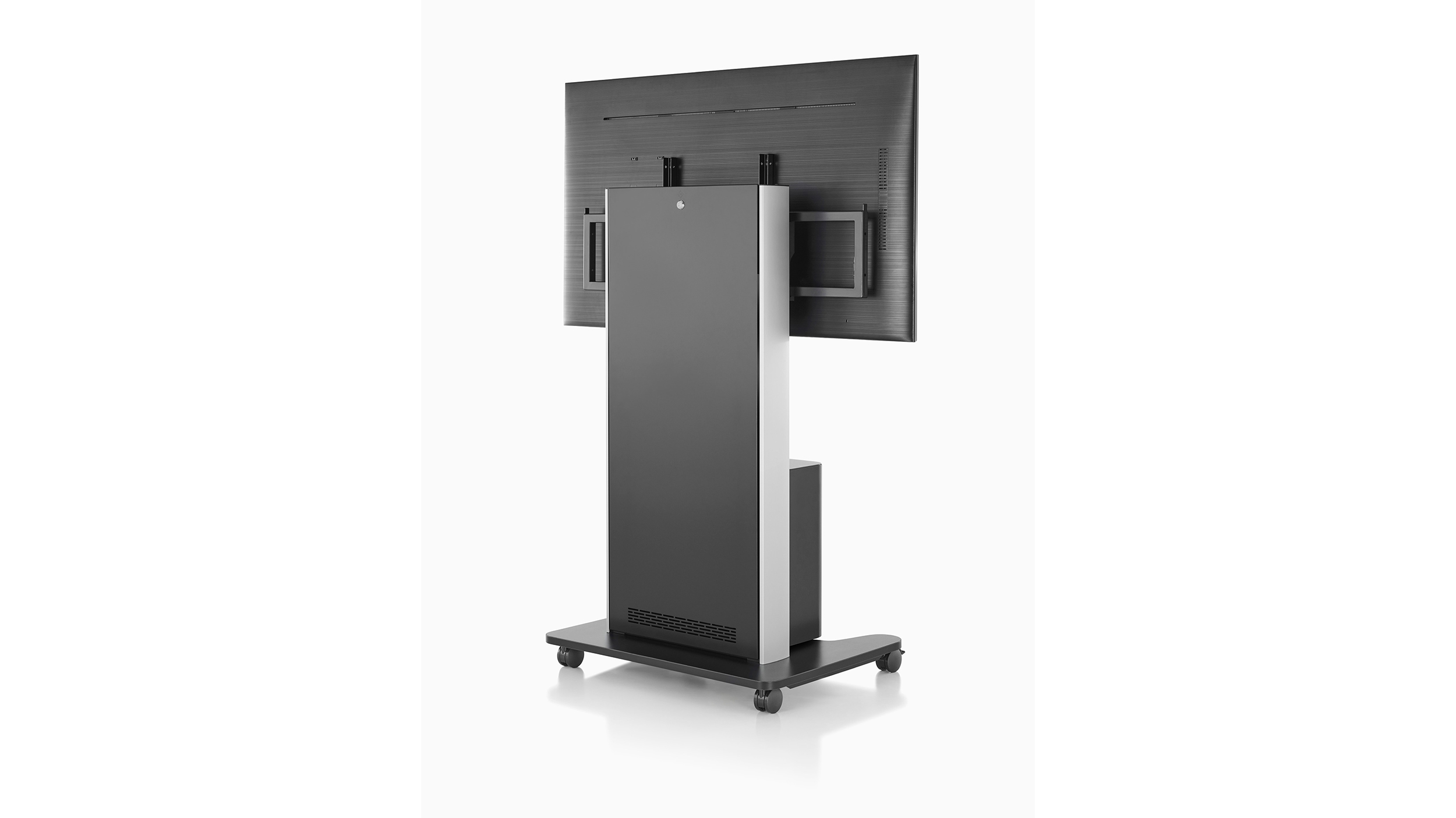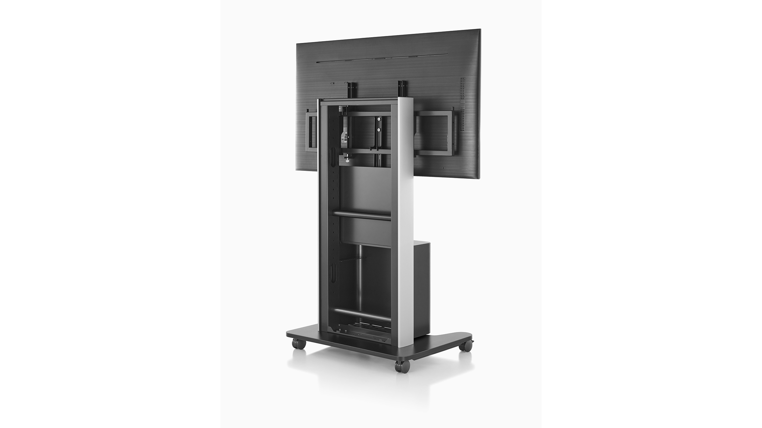 Permite que las personas que trabajan juntas disfruten de una experiencia a distancia más natural. AV/VC One puede soportar una pantalla de hasta 80” (203 cm) o dos pantallas de hasta 65” (165 cm) cada una, ya sea en posición vertical u horizontal. El estante frontal opcional brinda almacenamiento adicional, y un montaje de cámara ajustable le permite elegir la mejor posición para la aplicación.