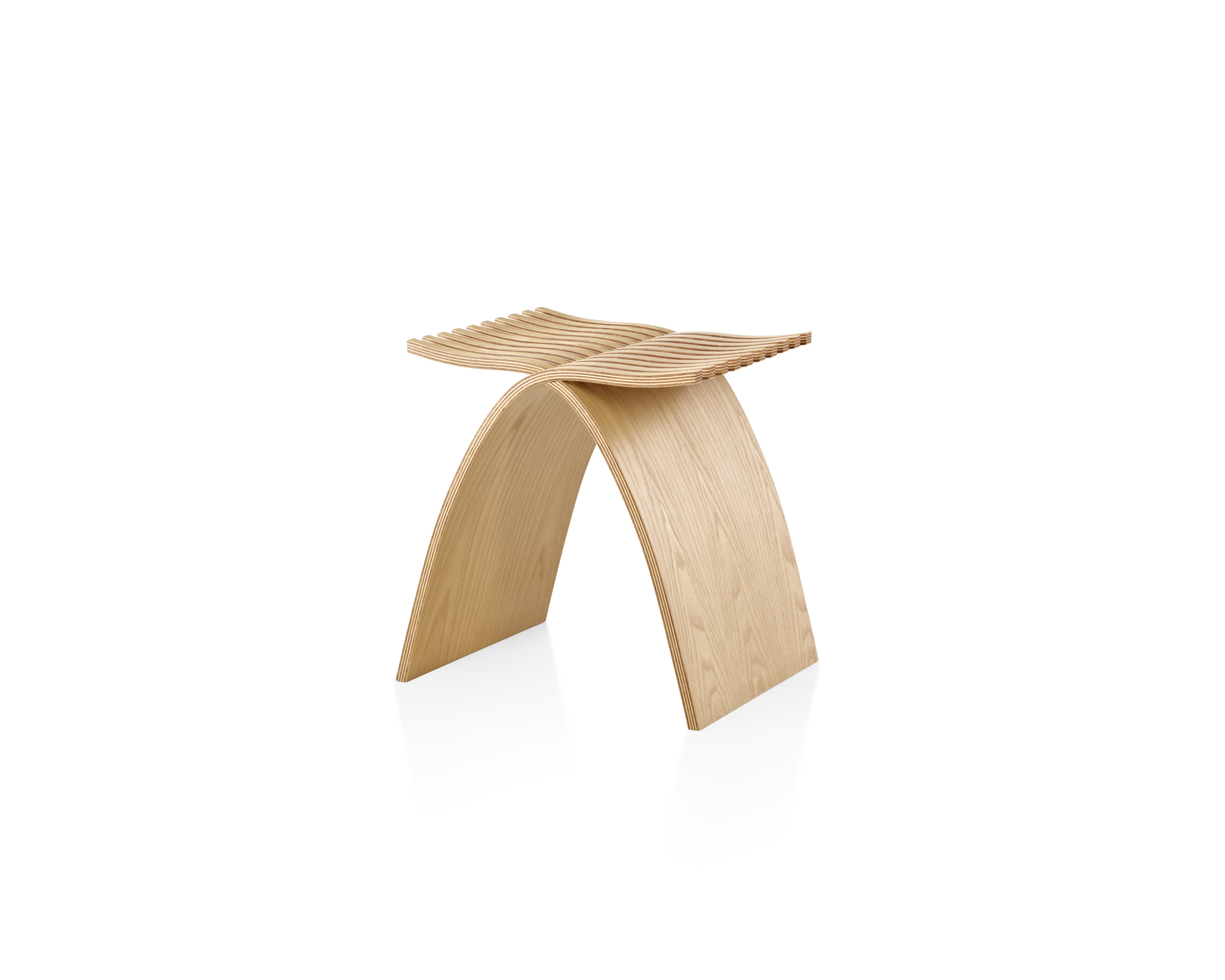 Dos piezas de madera laminada se acoplan para formar el taburete Capelli. Las superficies entre los "dedos" situados en la parte superior de cada pieza se encuentran y se convierten en topes que sostienen cada mitad del taburete firmemente. El taburete está compuesto por pliegues internos que alternan entre madera dura oscura y clara, y chapa de madera de fresno claro.