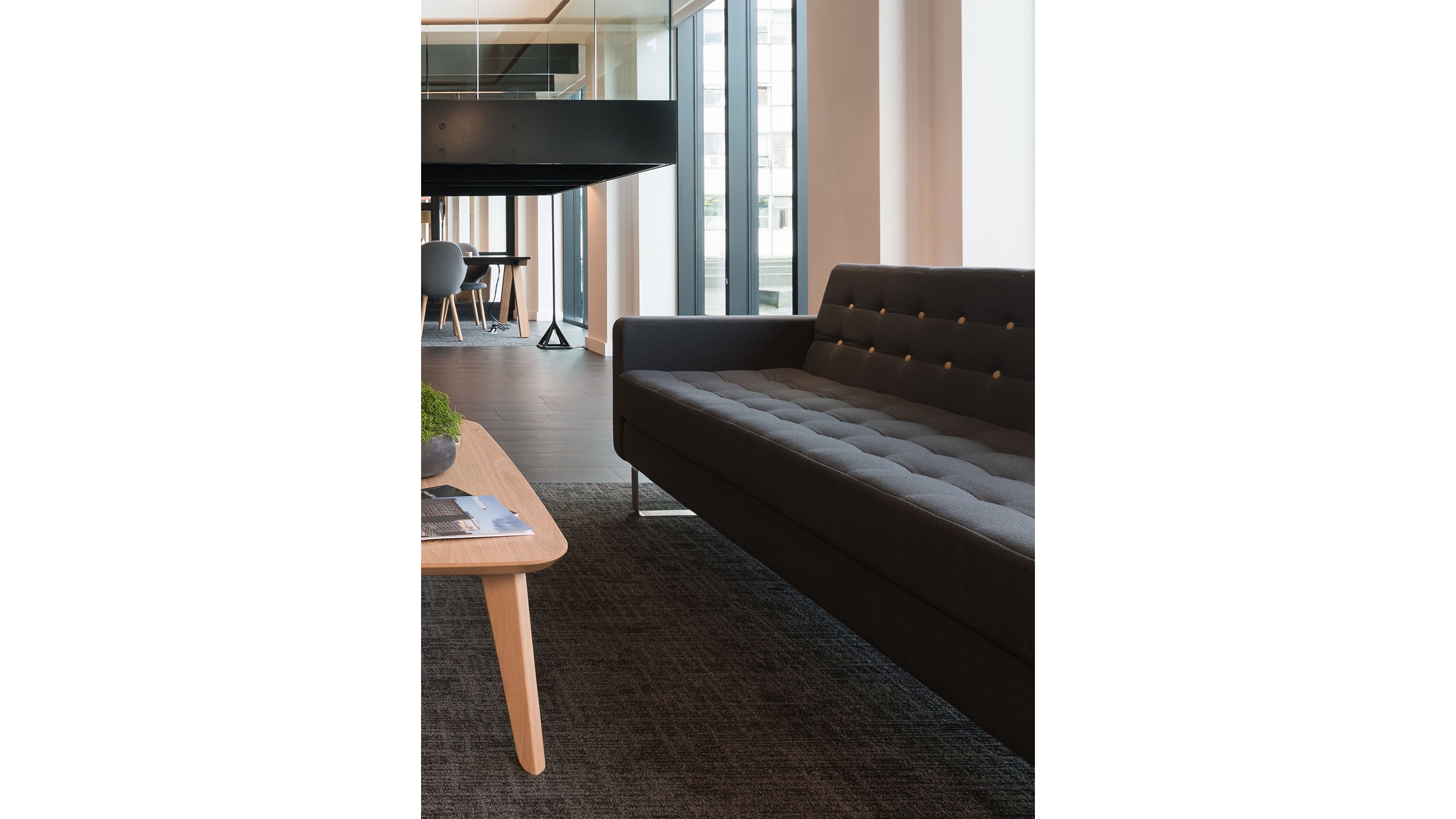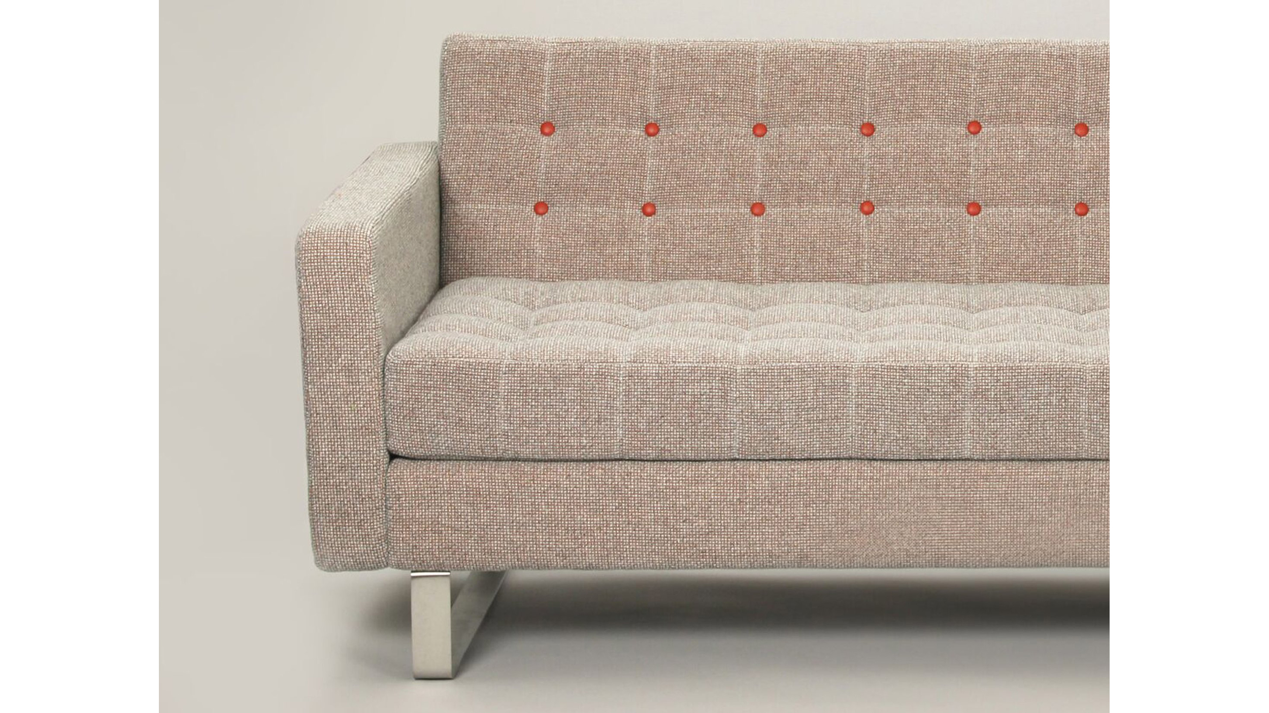Con un perfil reclinado, el asiento y el respaldo acolchonados capitoné, el sofá Clyde de naughtone tiene un aspecto fino y despejado. Diseñado para la comodidad con un aire formal, su forma compacta está disponible en dos tamaños, ambos con brazos o sin ellos, y ofrecen la opción de patas de madera maciza o base en patín de acero inoxidable.