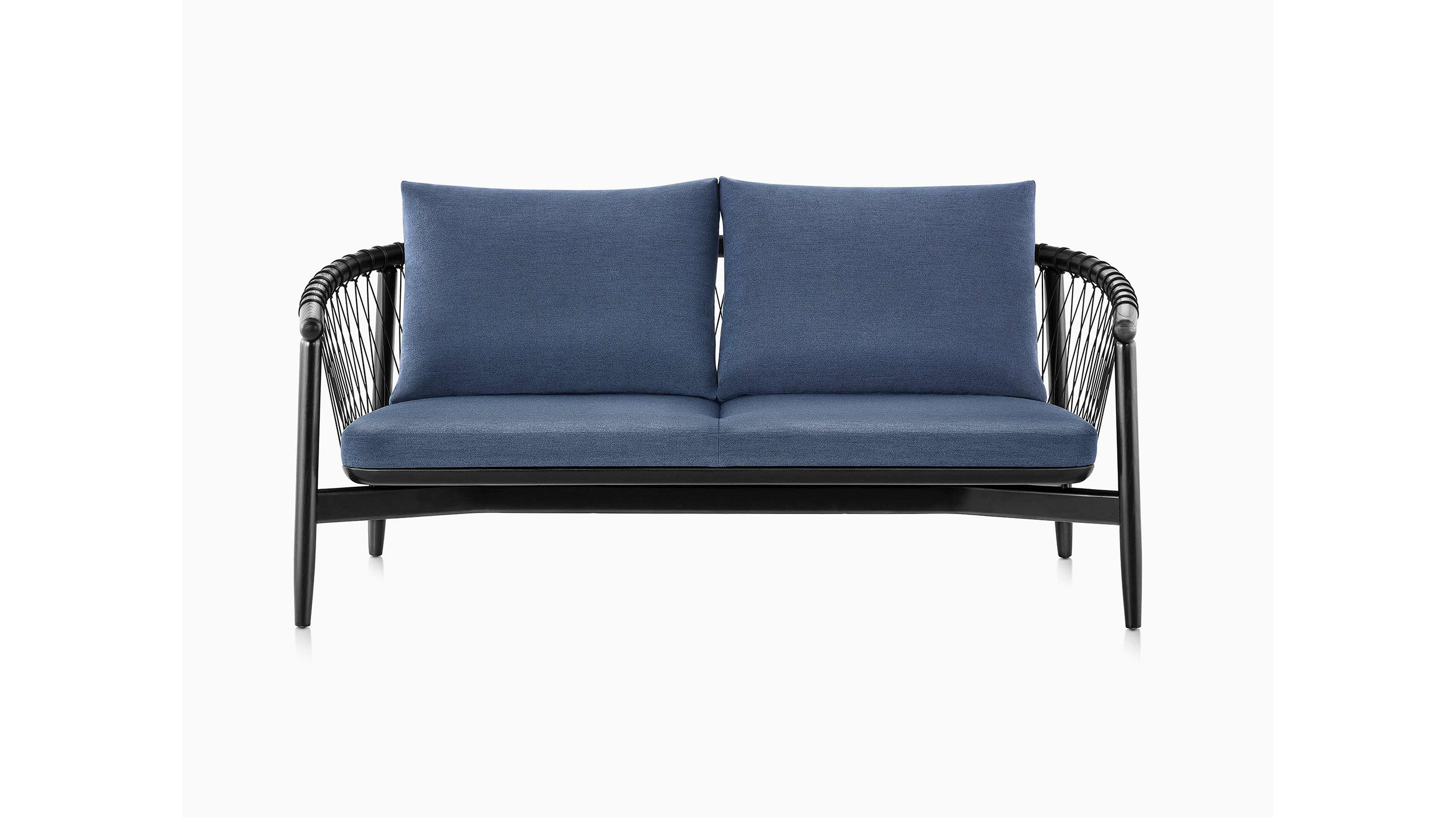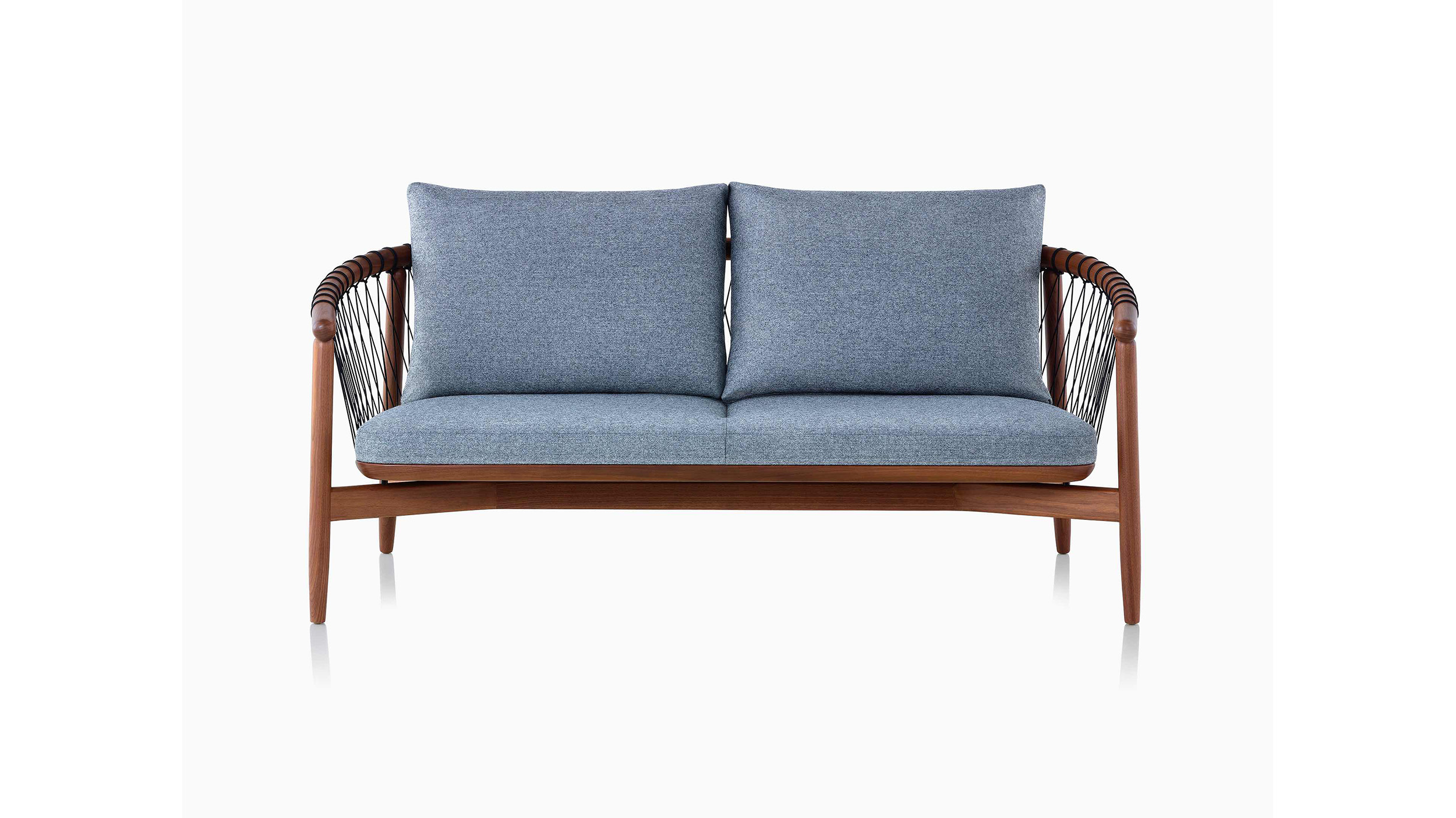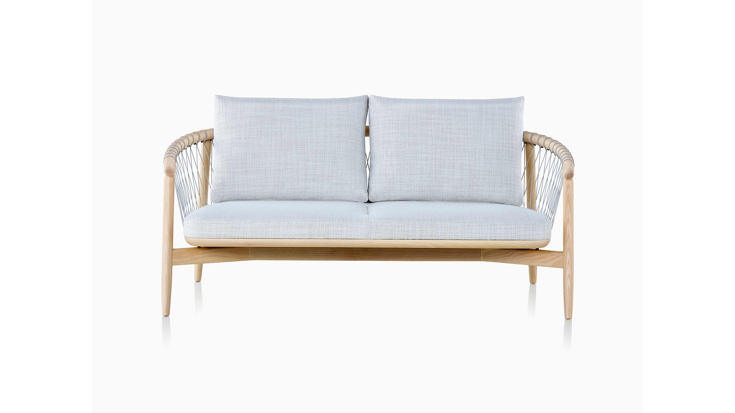 Un entramado de cuerdas para paracaídas tejido a mano, otorga al sofá Crosshatch su silueta transparente y ligera. Una bienvenida a la familia de sillería Crosshatch en la que se pueden sentar dos personas. El sofá está disponible en una amplia selección de acabados con marco de madera, opciones de tapicería y colores de cuerda. Diseñado por EOOS para Geiger, el sofá Crosshatch es parte de la colección Herman Miller.