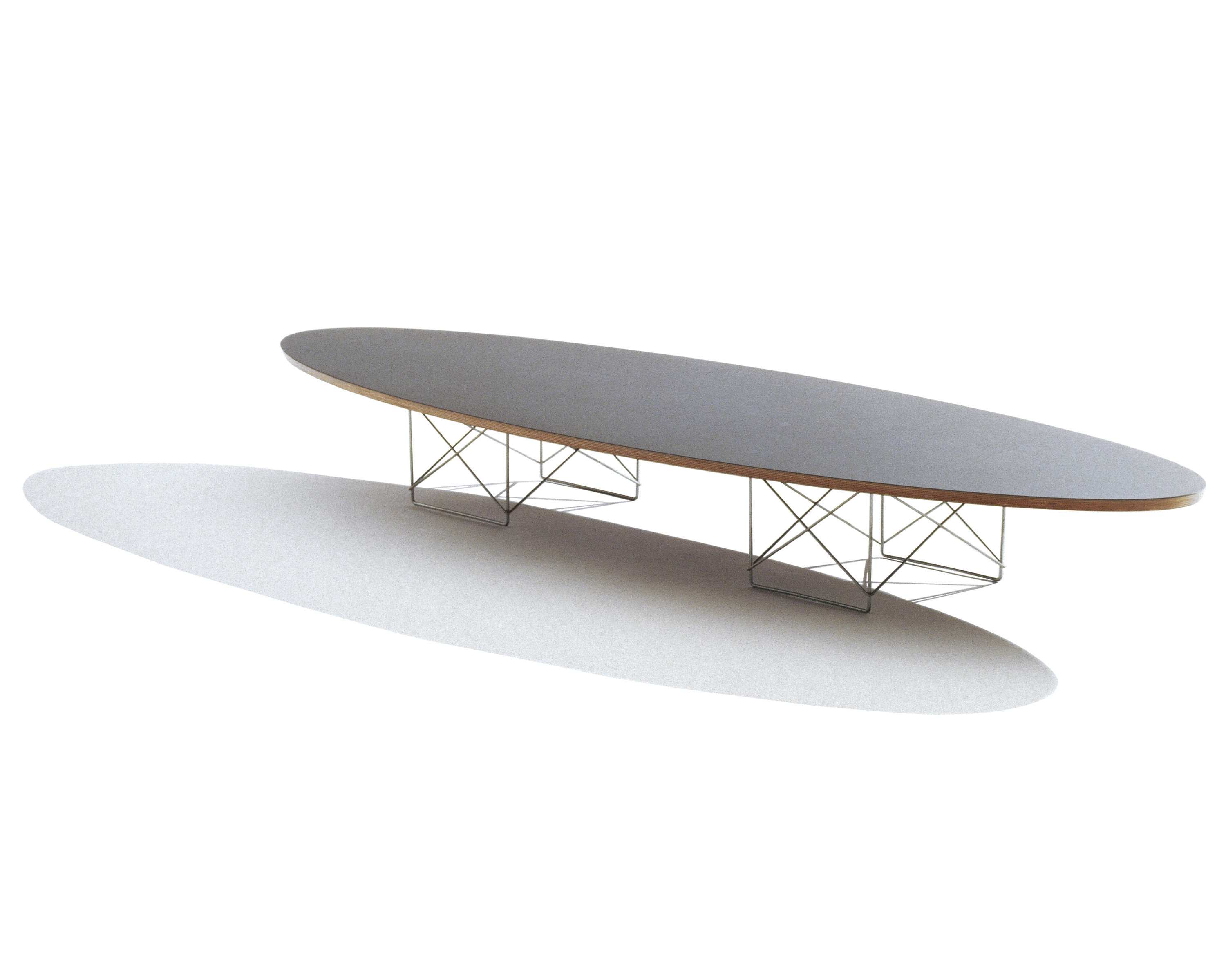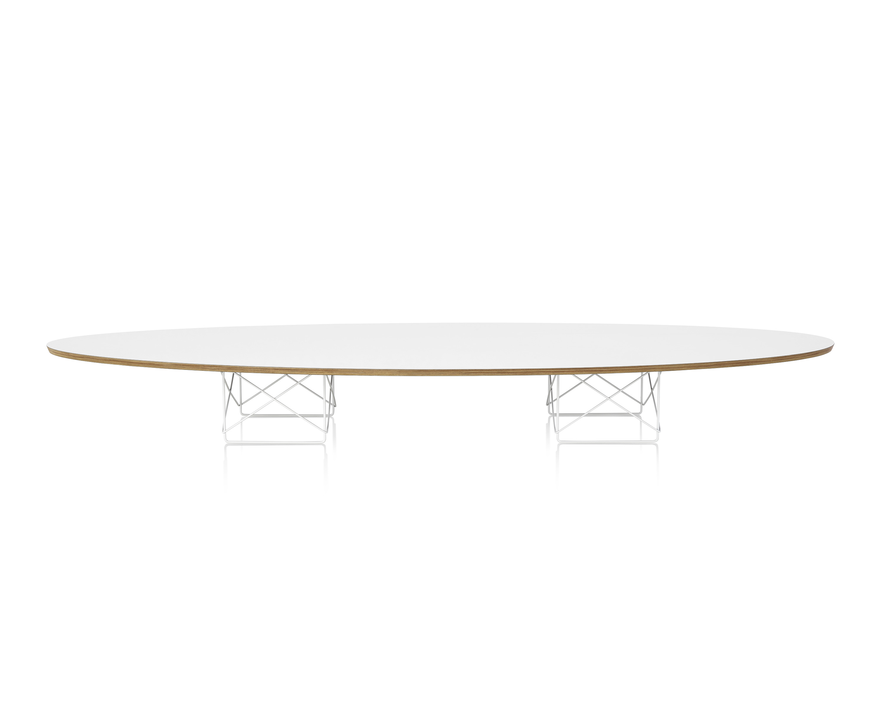 Con su perfil alargado y de poca altura, la mesa elíptica con base de alambre Eames se ubica dramáticamente frente a un sofá alargado o en el medio de un grupo de sillas. Crea un escenario sorprendente para exhibir jarrones de fat lava de mediados de siglo, flores frescas, revistas o un libro especial en un living, una sala de espera, un área de recepción o un área de descanso para ejecutivos. Disponible con laminado negro o blanco, esta mesa marca una diferencia por su solidez y belleza dondequiera que esté.
