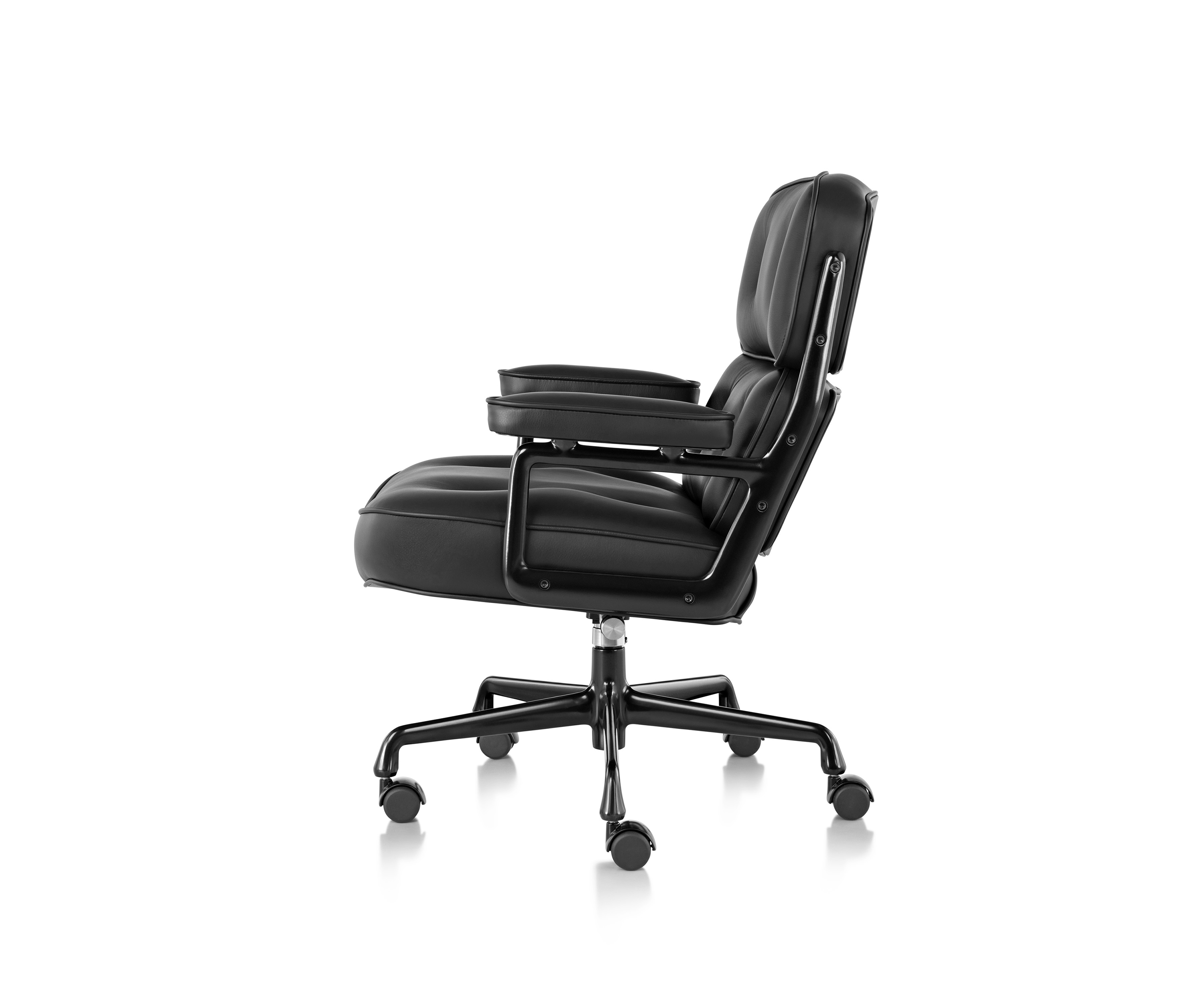 Esta silla lujosa es un ejemplo de la convicción de Charles Eames de que "los detalles no son detalles; crean el producto". De tamaño generoso, la silla ejecutiva de trabajo presenta una estructura y base de aluminio liviana y tiene finos detalles de cuero o tapicería de géneros, acentuada con botones cubiertos y detalles en los bordes típicos de los muebles finos tradicionales.