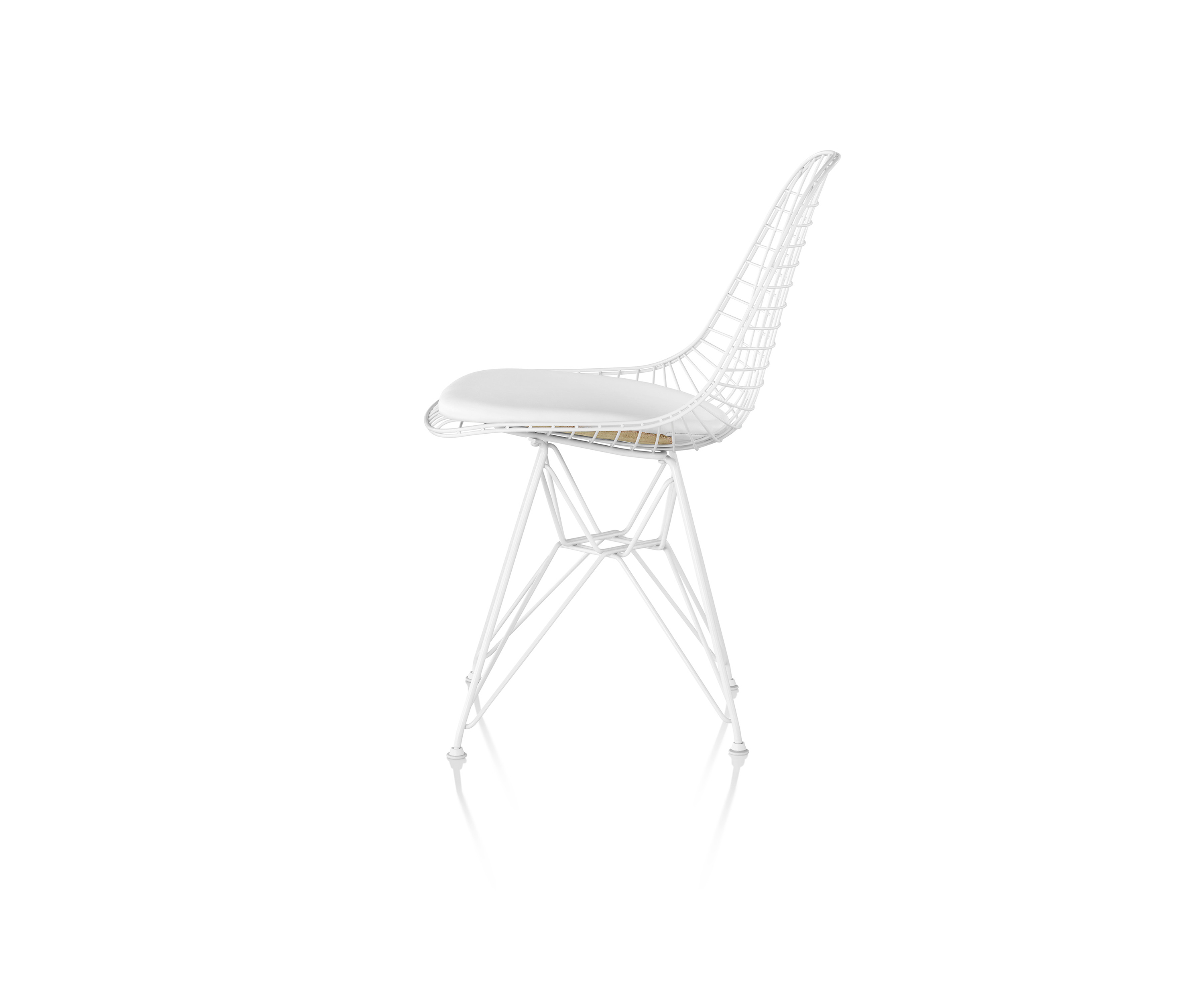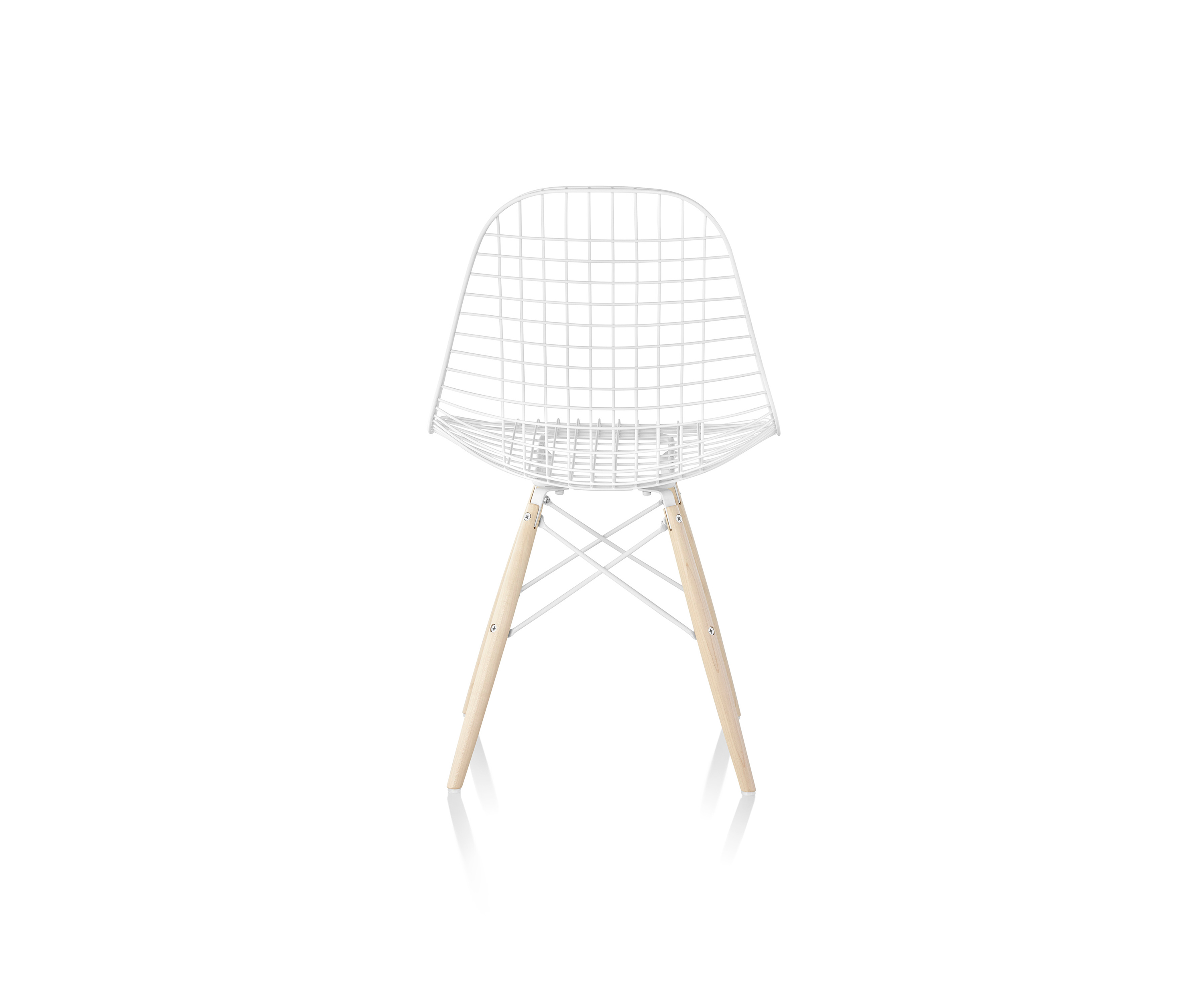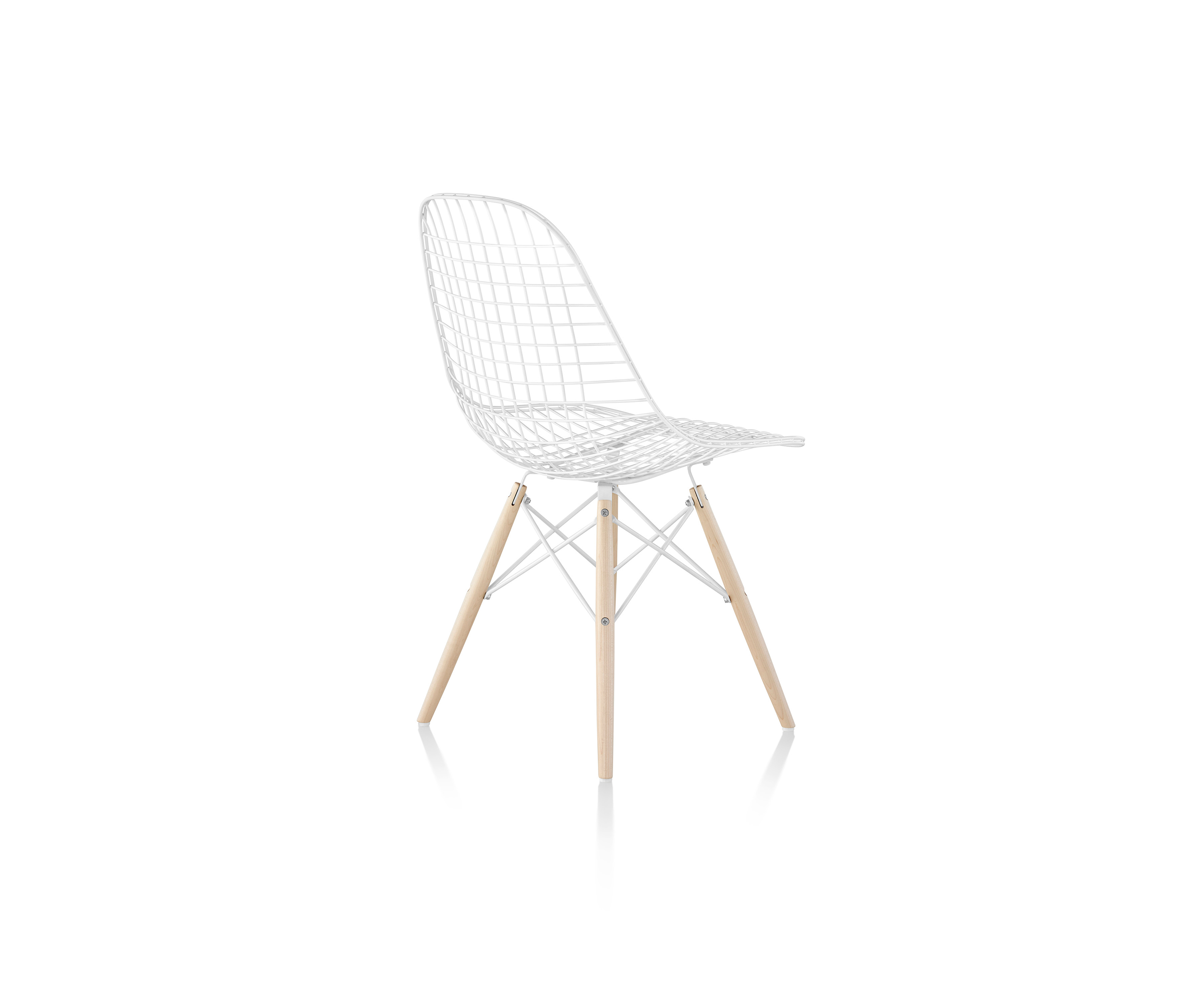 En la década de 1950, Eames Office comenzó a experimentar en el curvado y la soldadura de alambre. Inspirados en bandejas, formas de vestidos y canastas, el equipo desarrolló una serie de piezas, incluida la versión de alambre de la forma Shell. La silla Eames Wire viene con una base de alambre y una almohadilla opcional y entrecruzada o una almohadilla "bikini" de dos piezas realizadas en piel.