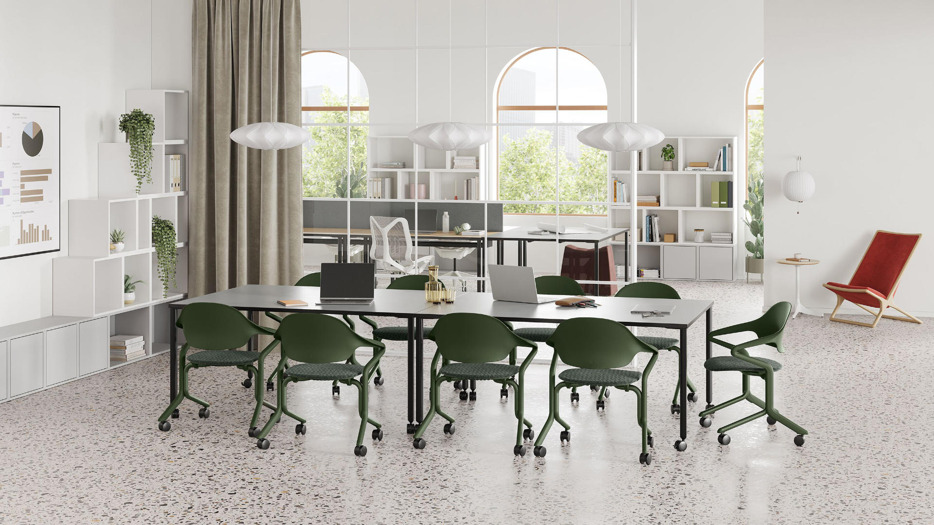 Con su estética refrescante, Fuld se destaca entre las sillas nido, lo que te permite reconfigurar el espacio para diferentes usos, como sesiones de trabajo y eventos educativos, sin sacrificar el estilo. Diseñada para la practicidad, cuenta con asientos abatibles y patas que salvan paredes, ya que evitan que el respaldo roce contra las paredes. Las líneas únicas y el aspecto monocromático o multicolor de Fuld dan vida a cualquier espacio, incluso cuando se almacenan al aire libre, lo que demuestra que lo funcional puede ser atrevido.