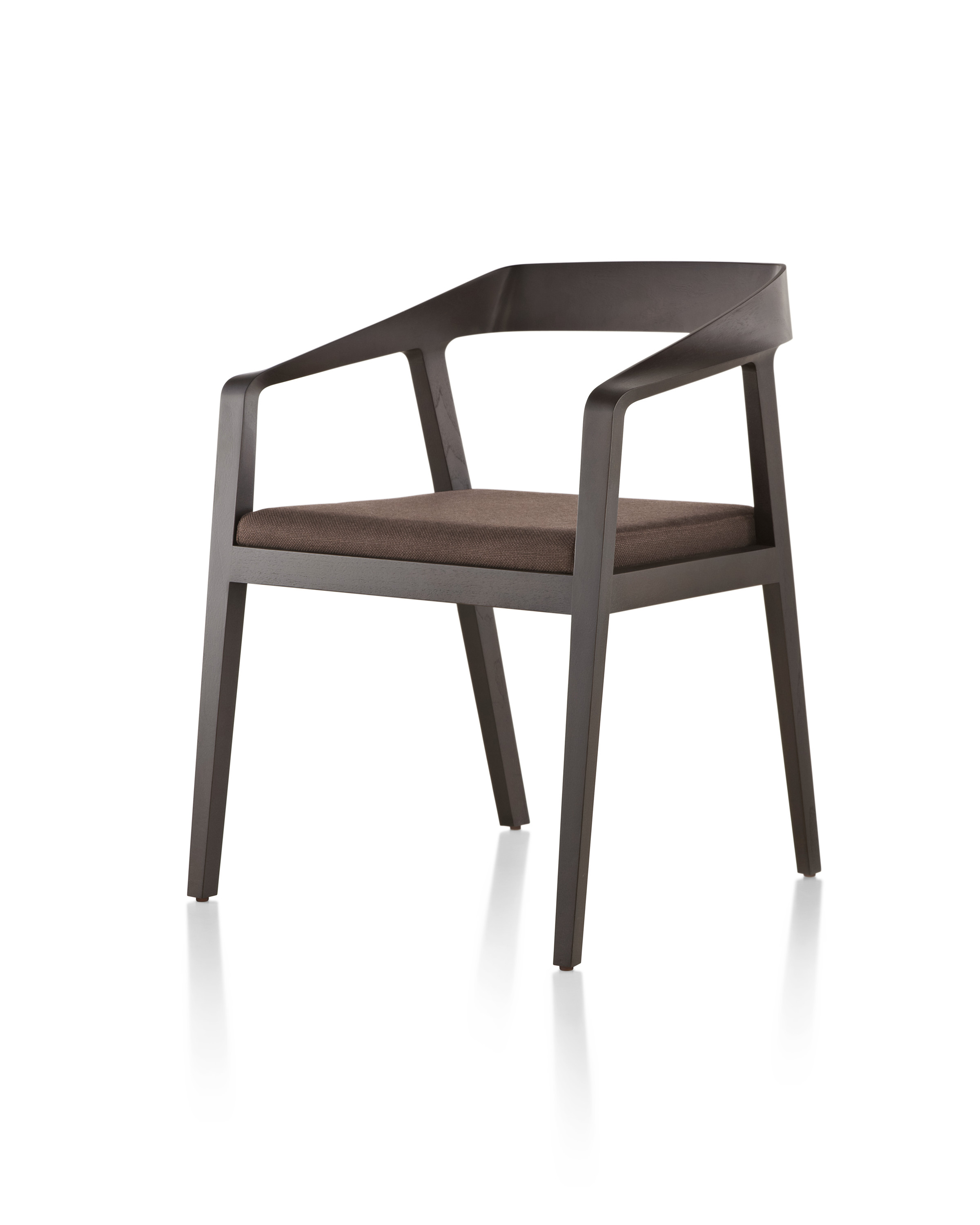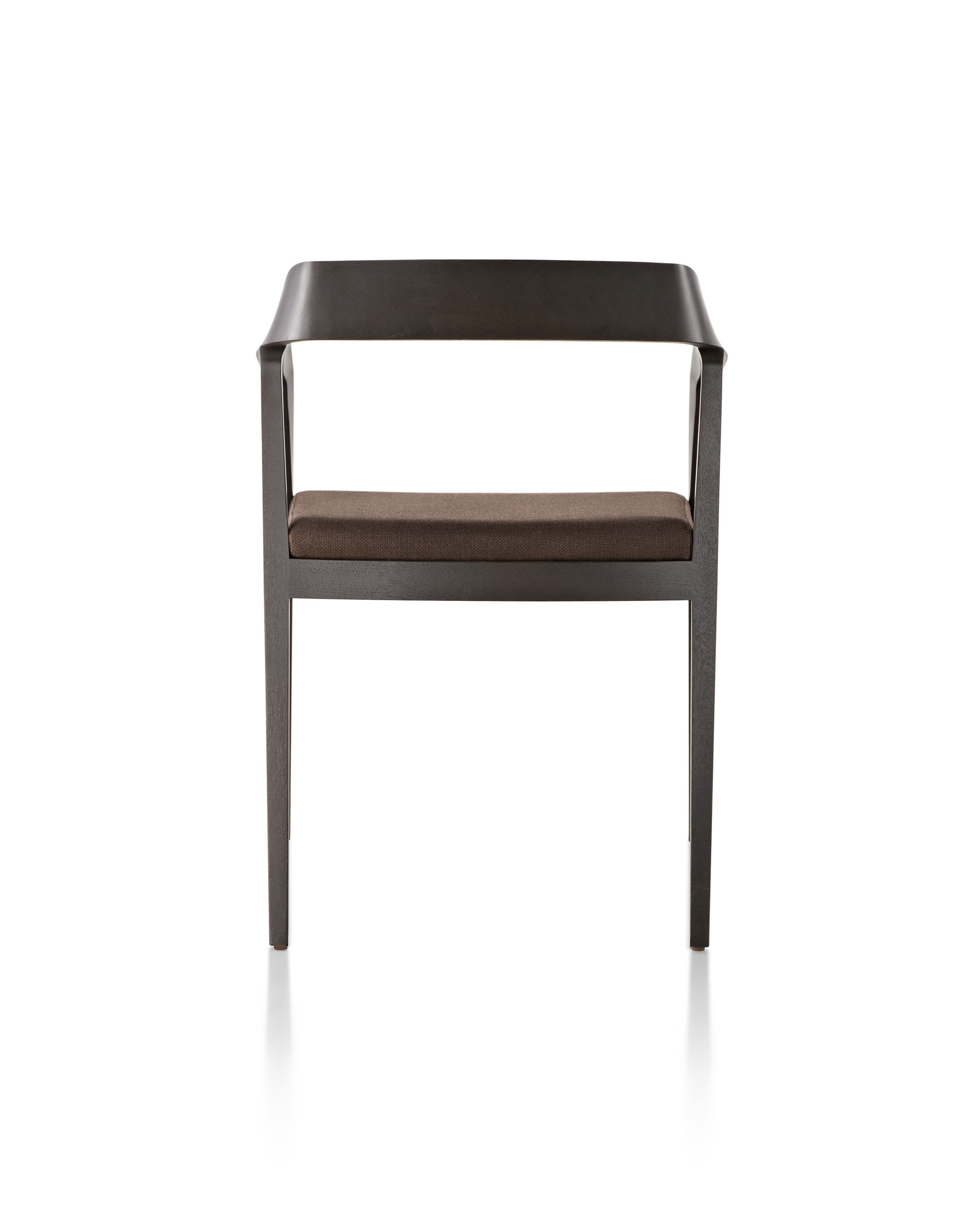 La silla para visitas Full Twist de Mark Goetz es una silla de madera maciza versátil y cómoda, y tiene un asiento tapizado. La silla presenta una singular cinta de madera esculpida que se incorpora a las patas, a la vez que forma los descansabrazos y un respaldo levemente inclinado que arropa a quien se sienta.