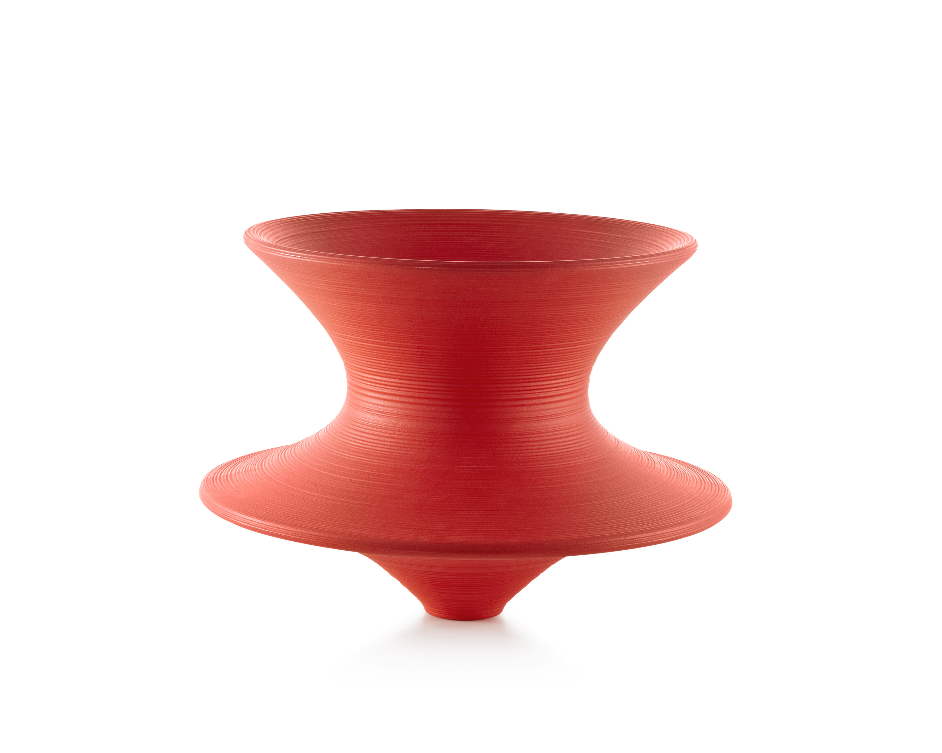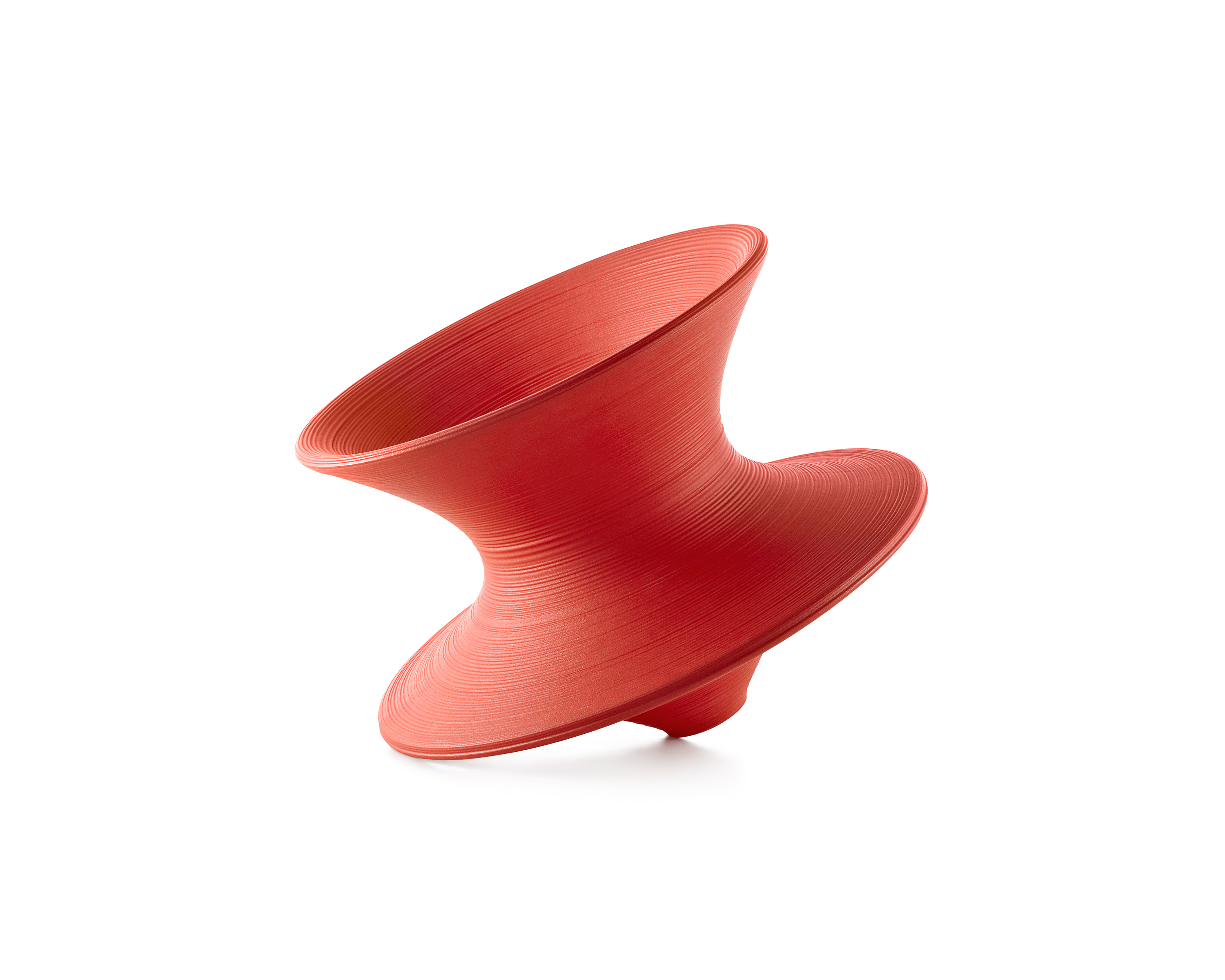 Cuando está erguida, Spun tiene la silueta de una vasija escultural; si está inclinada sobre uno de los laterales, se convierte en una silla divertida y funcional que le permite mecerse y dar vueltas. El arquitecto y diseñador Thomas Heatherwick creó la silla Spun por medio de una técnica de rotomoldeo para dar forma al plástico. Estas sillas, fabricadas en polipropileno, pueden usarse bajo techo y al aire libre.