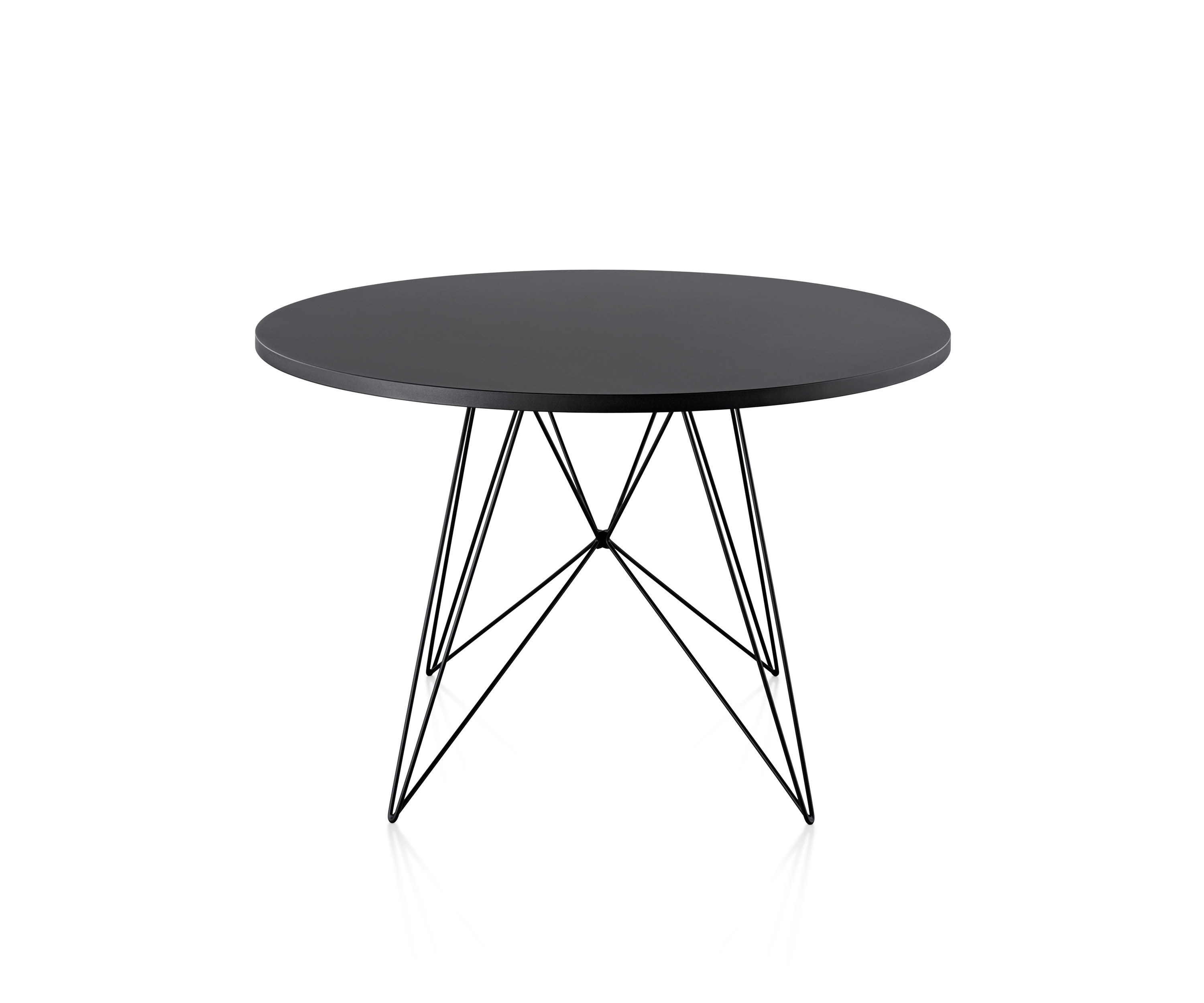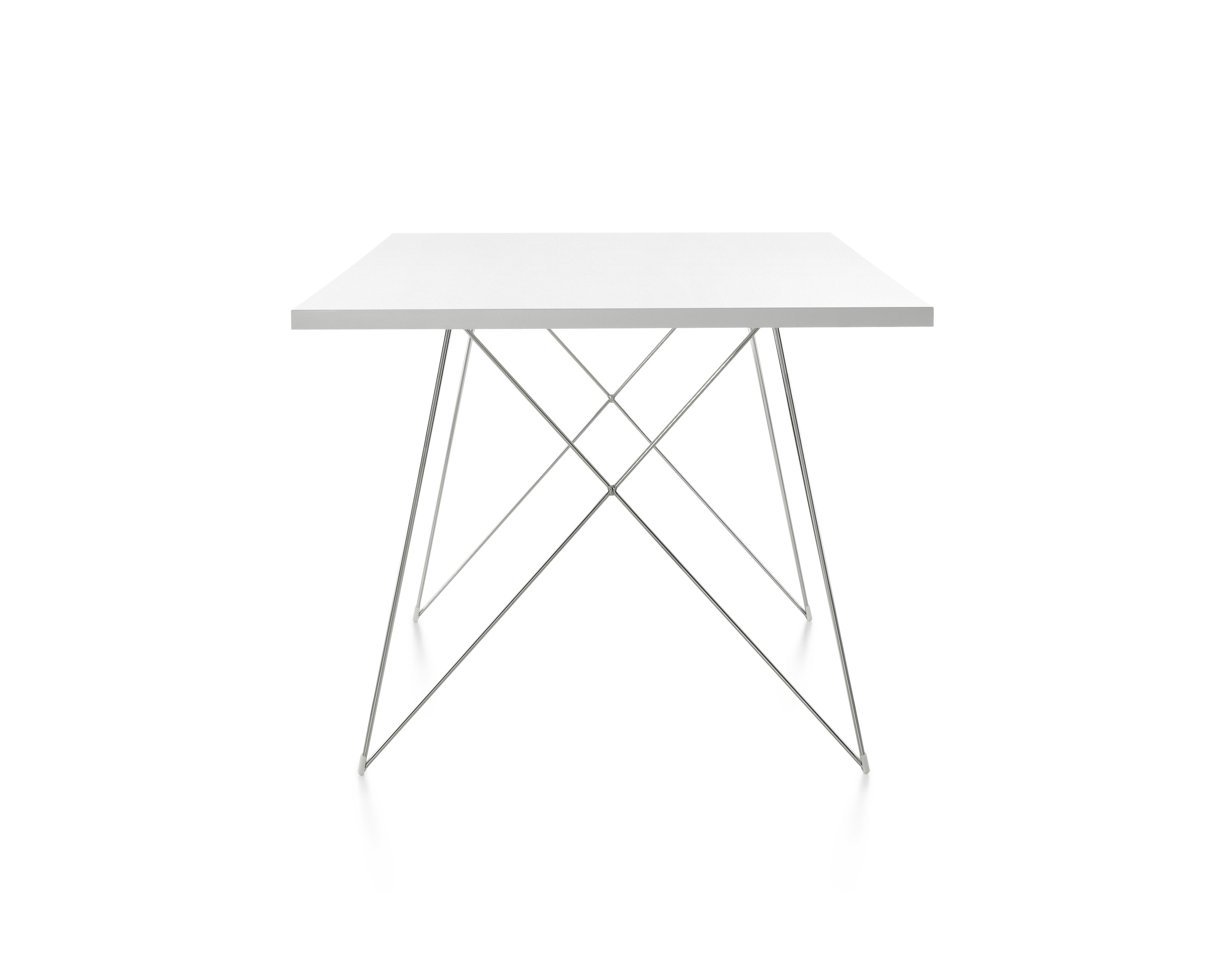 Las mesas Tavolo son robustas y versátiles, están compuestas por bases con varillas de acero en cromo o resina epoxy blanca y tienen una superficie de MDF con cubierta de polímero. Combinan perfectamente bien con las sillas de plástico moldeado Eames con bases de alambre.