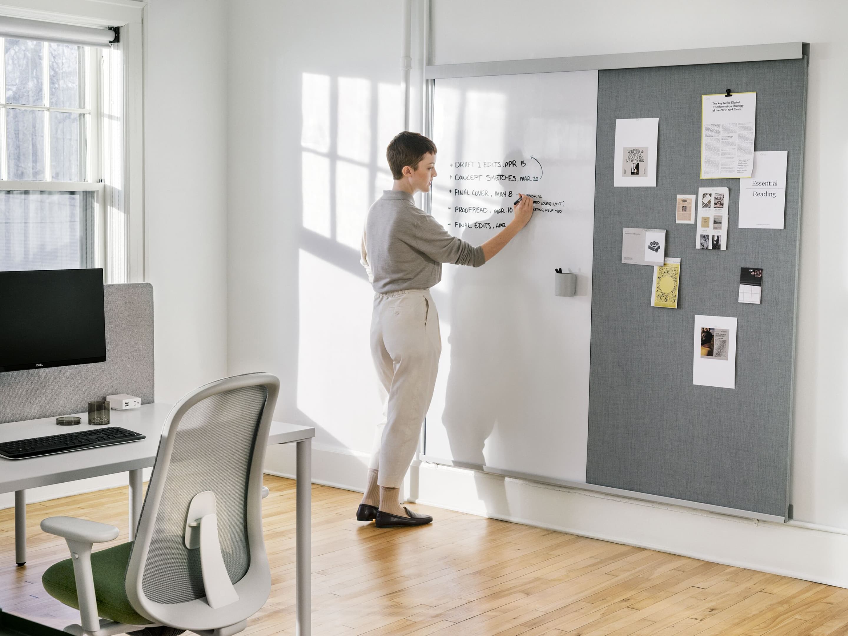 El vaso de marcadores OE1 se ha diseñado para lograr una colaboración flexible. Se adhiere fácilmente a las pizarras blancas y a otras superficies, y luego puede moverse a otro sitio donde sea necesario. Parte de la Colección espacio de trabajo OE1.