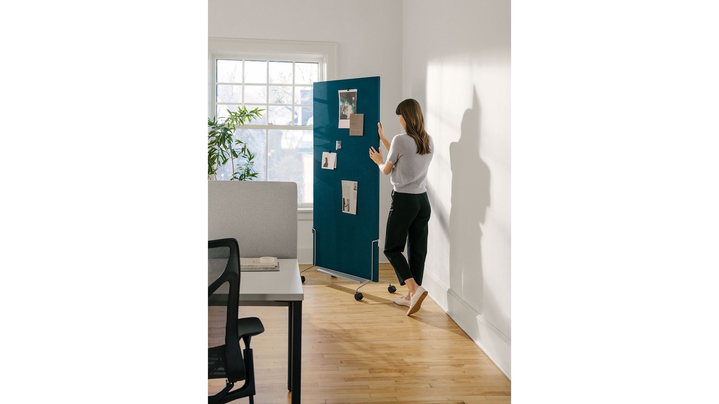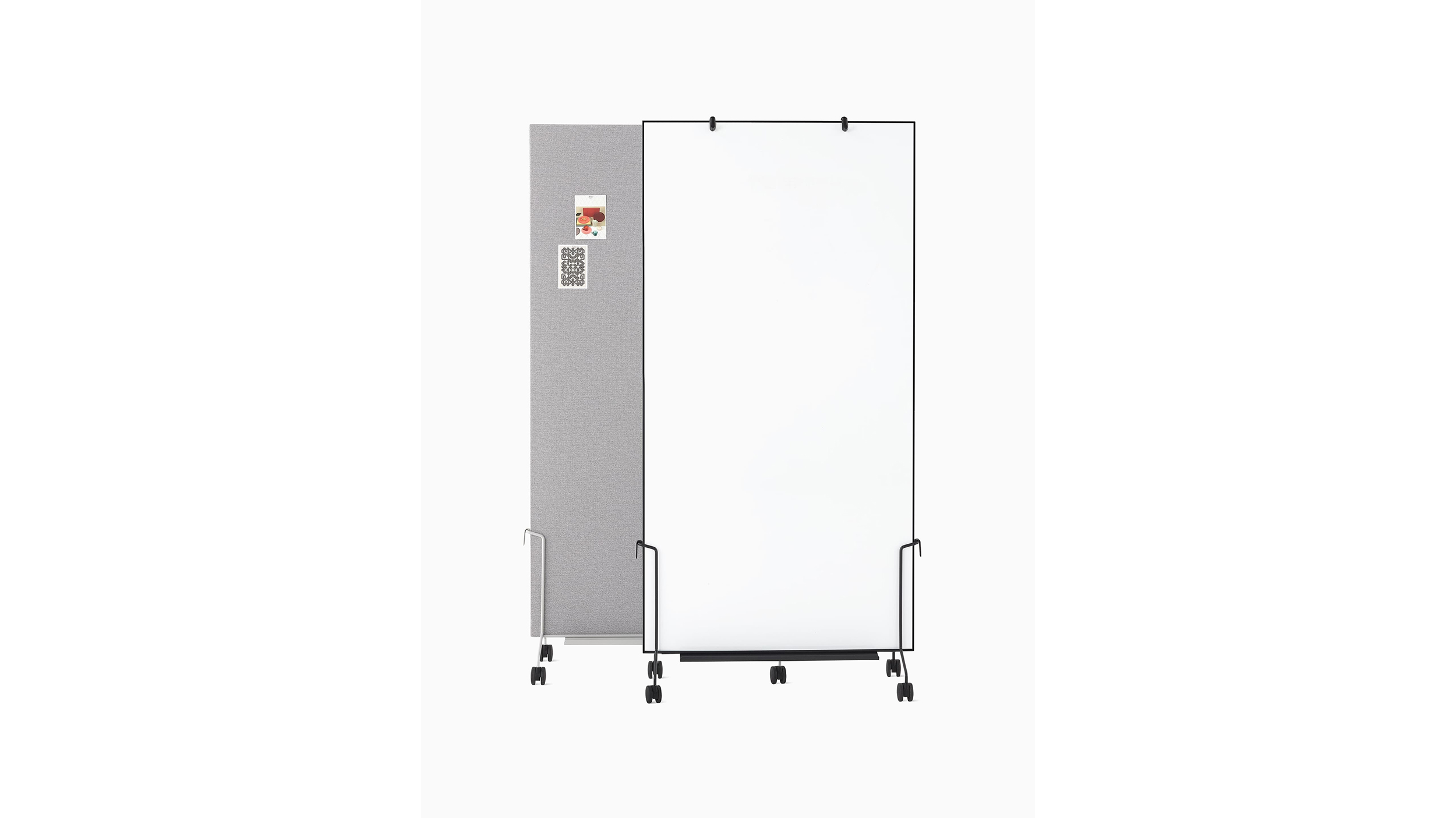 El atril móvil OE1 permite una colaboración flexible para los equipos donde sea que trabajen. Sus pizarras blancas y tableros para tachuelas se pueden utilizar también como delimitadores de espacio móviles y funcionan en conjunto con el riel y panel para pared OE1. Parte de la Colección espacio de trabajo OE1.