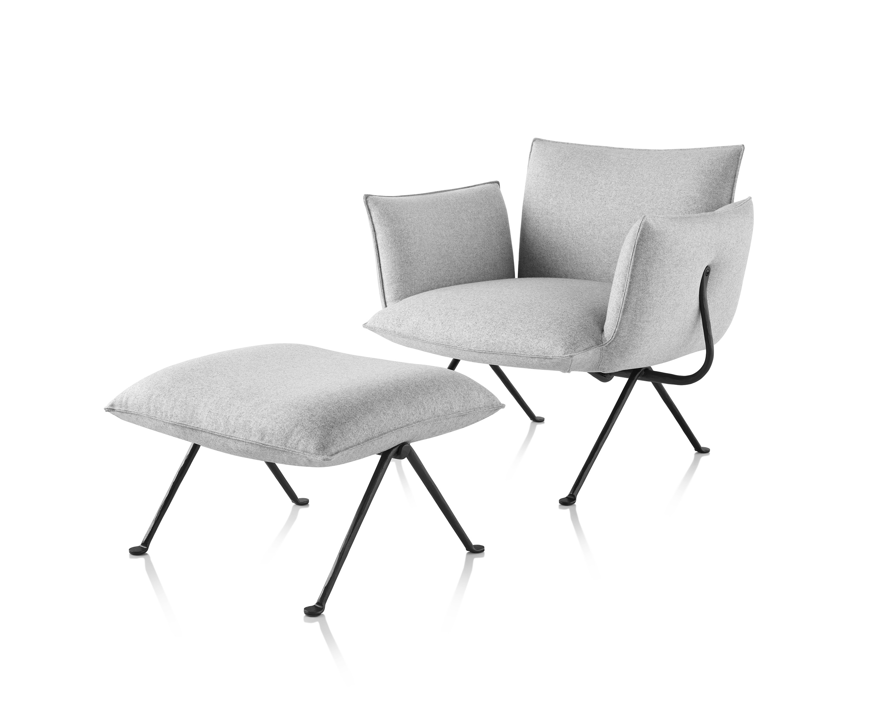 Los cojines tipo almohada del Sillón y descansapies Magis Officina presentan un contraste visual fascinante con las estructuras mínimas de las varillas de hierro soldado. La estructura de hierro forjado, con leves imperfecciones propias del forjado artesanal, está disponible con acabado galvanizado o pintada de negro. Los cojines vienen en una variedad de telas lujosas.