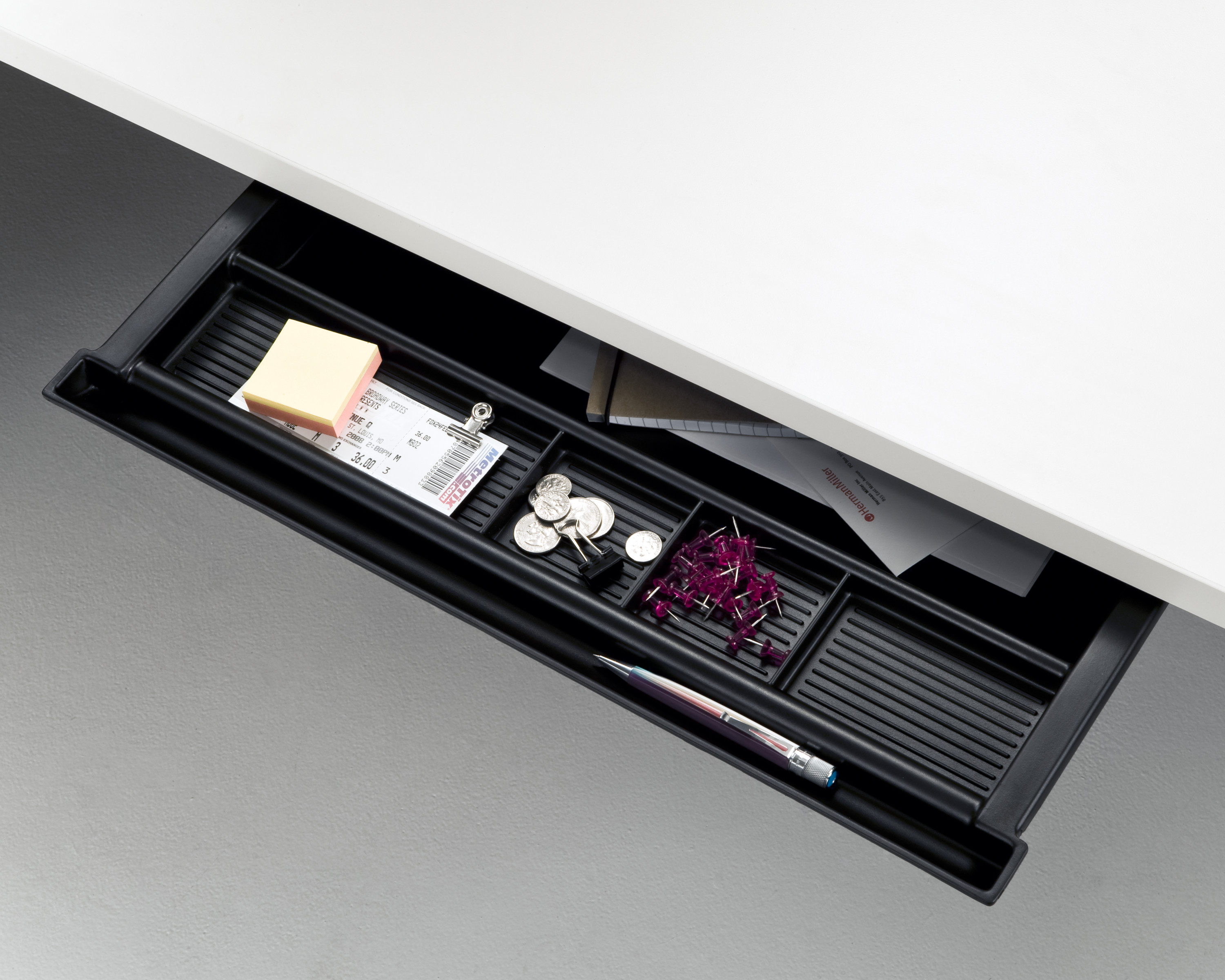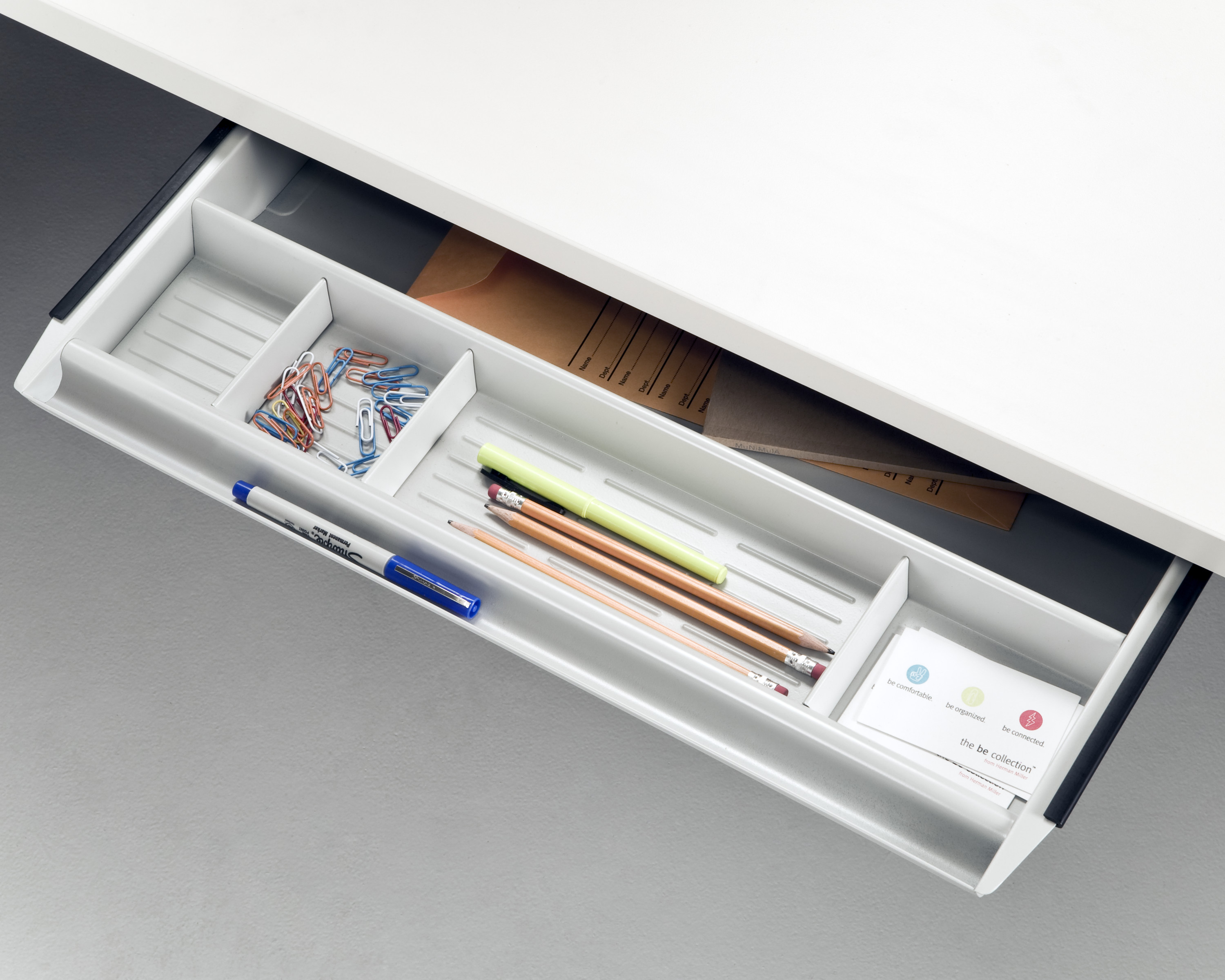 Práctico y versátil. Este cajón compacto tiene una gran capacidad y algunos divisores que lo ayudan a organizar papel, lápices y bolígrafos, tachuelas, sujetapapeles y objetos personales. Se monta sobre una superficie colgante o sobre una superficie de trabajo independiente. Disponible en versiones de plástico y metal.