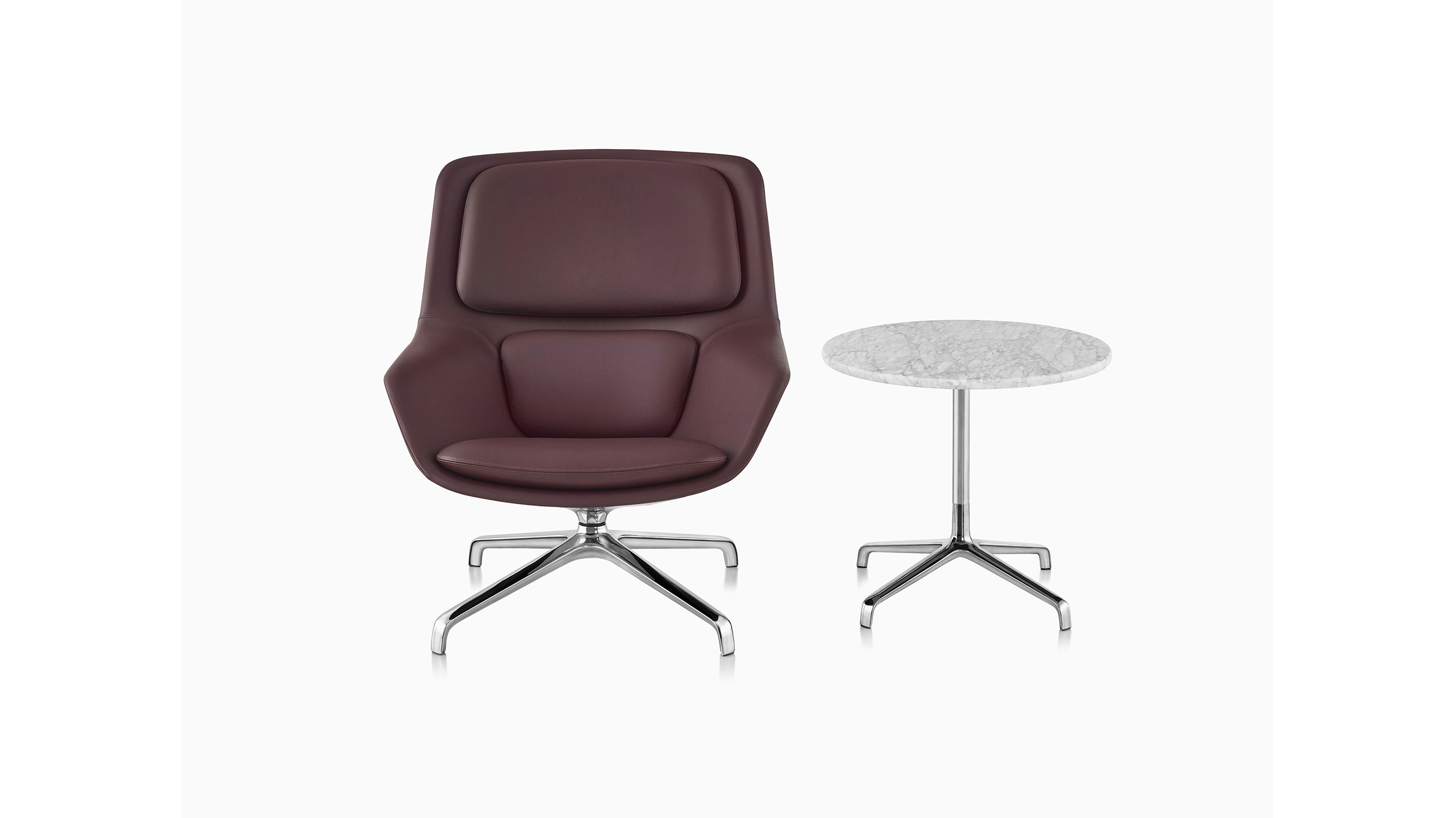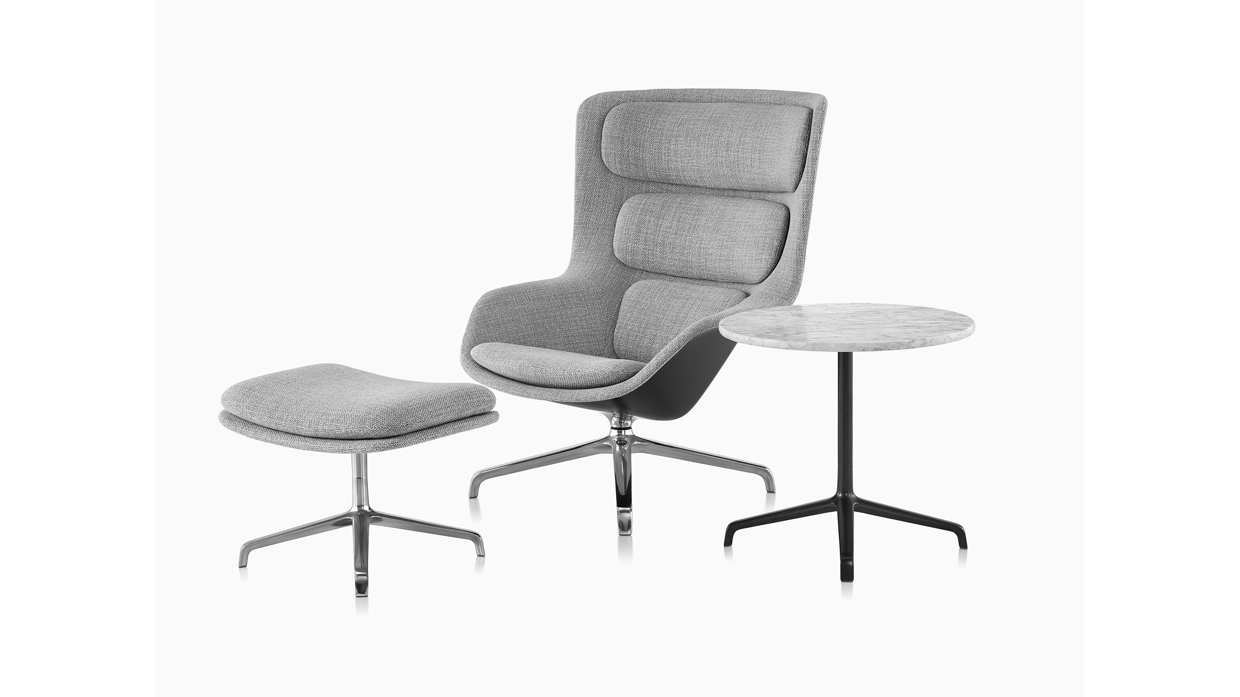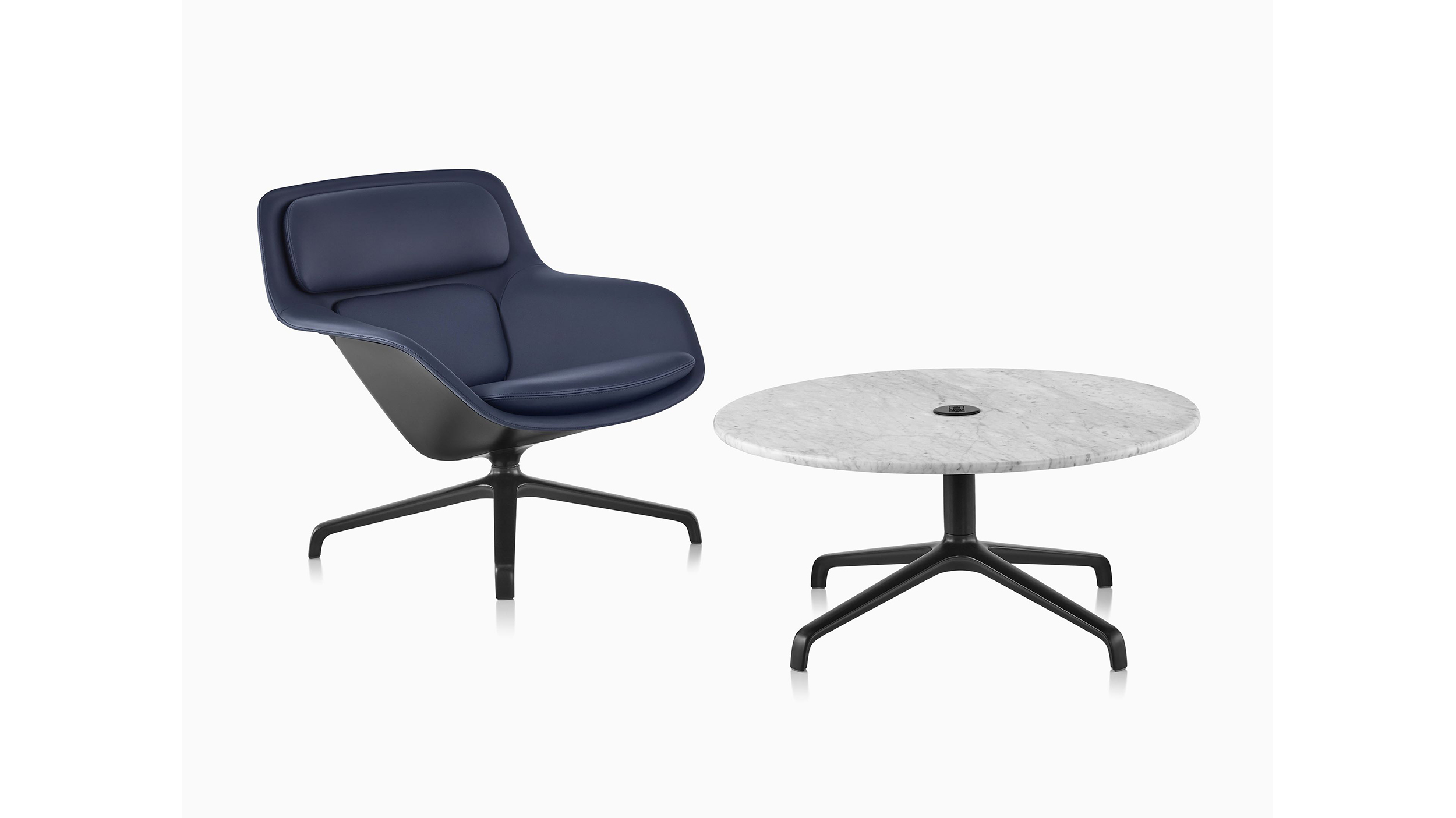Ampliando la idea de comodidad que inspiró a los diseñadores Markus Jehs y Jürgen Laub para crear su silla lounge Striad, las mesas Striad en combinación brindan una presencia segura a una variedad de esquemas laborales. Del mismo modo en que una hermosa mesa de café consolida una sala de estar, estas mesas auxiliares sirven como puntos de reunión para reuniones informales o tareas que requieren concentración. Los tableros se fijan a la altura perfecta para apoyar computadoras portátiles y otras herramientas de trabajo, con una selección de unidades USB u otras opciones de tomacorriente disponibles para mantenerlas cargadas sin comprometer el atractivo cálido y residencial. Las bases comparten el mismo perfil y materialidad elegantes que la base de estrella de cuatro puntas de la silla lounge Striad.